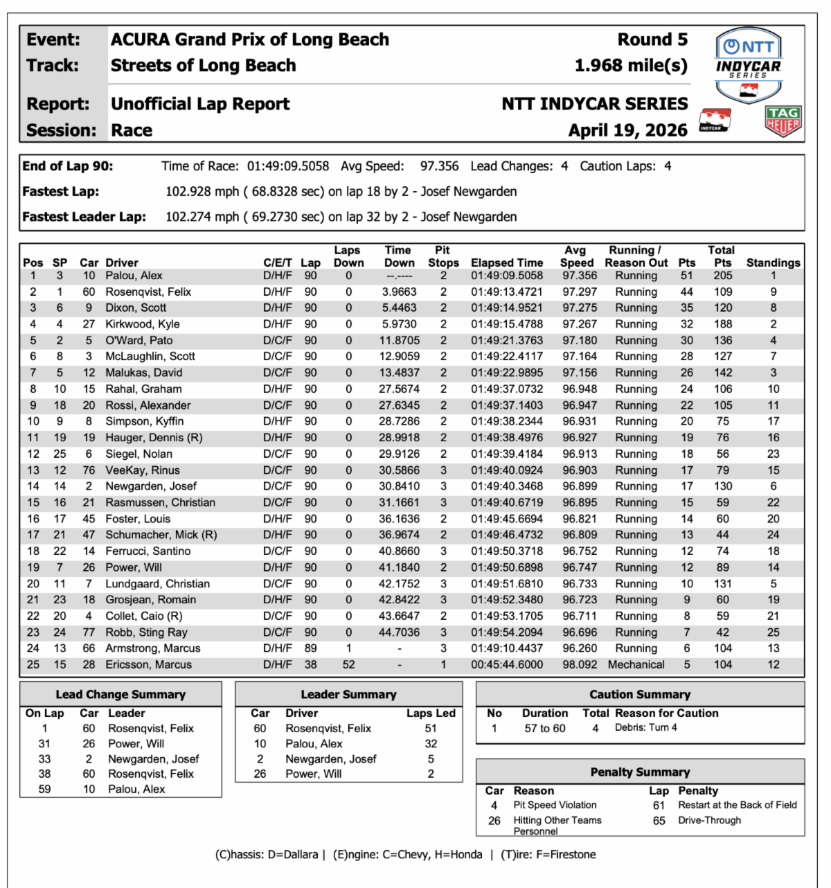 | CHEVROLET IN THE NTT INDYCAR SERIES Grand Prix Of Long Beach1.968-mile, 11 turn, Long Beach street circuitLong Beach CaliforniaSunday Race ReportApril 19, 2026 Long Beach, California (April 19, 2026) – Pato O’Ward in the No. 5 Arrow McLaren Chevrolet was the best of the Chevrolet-powered drivers, finishing in fifth place on the Streets of Long Beach. O’Ward was joined in the top ten by sixth-place Scott McLaughlin in the No. 3 AAA Travel Team Penske Chevrolet, seventh-place David Malukas in the No. 12 Verizon Team Penske Chevrolet and ninth-place Alexander Rossi in the No. 20 ECR Liquid Science Orange Chevrolet. The fifth-place finish was the fourth of the season for O’Ward and 52nd (all of them with Team Chevy) in his career, which moves the 26-year-old into a tie for 33rd all-time with Alexander Rossi and Tony Bettenhausen.Nolan Siegel, the driver of the No. 6 SmartStop Arrow McLaren Chevrolet, was the biggest mover of the race, finishing 12th after starting 25th. Alexander Rossi in the No. 20 ECR Liquid Science Orange Chevrolet was also a significant mover, finishing 9th after starting 18th. Josef Newgarden, who was one of a half-dozen drivers to utilize a three-stop strategy in the No. 2 Astemo Team Penske Chevrolet, set the quickest lap of the race, with a 68.8328-second lap of the 1.968-mile, 11-turn Long Beach street circuit. Chevrolet-powered Rinus VeeKay in the No. 76 Juncos Hollinger Chevrolet, Christian Lundgaard in the No. 7 VELO Arrow McLaren Chevrolet and David Malukas in the No. 12 Verizon Team Penske Chevrolet had the second through fourth fastest laps. Newgarden also made the most on-track passes, getting by 11 drivers.Chevrolet-powered drivers David Malukas, Pato O’Ward, Christian Lundgaard, Josef Newgarden and McLaughlin are third through seventh in the NTT INDYCAR SERIES championship standings. |