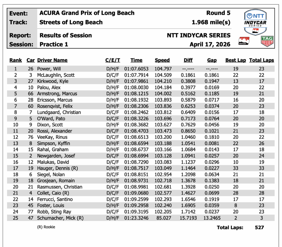 | CHEVROLET IN THE NTT INDYCAR SERIES Grand Prix Of Long Beach1.968-mile, 11 turn, Long Beach street circuitLong Beach CaliforniaFriday Practice ReportApril 17, 2026 LONG BEACH, California (April 17, 2026) – For the fourth straight road and street course, Scott McLaughlin was the quickest Chevrolet-powered driver during the first practice, with Arrow McLaren teammates Christian Lundgaard in the No. 7 VELO Arrow McLaren Chevrolet and Pato O’Ward also had top ten pace in the first practice on the 1.968-mile, 11-turn, Long Beach street circuit. For the 2026 NTT INDYCAR SERIES season, the first practice on the road and street courses is split into three portions, with the entire field running the first forty minutes, and the field split in two for a pair of 12-minute sessions. Chevrolet-powered drivers took six of the top 10 spots in the first 40 minutes, with drivers utilizing the Primary Firstone Firehawk racing tires (Black), with Pato O’Ward in the No. 5 Arrow McLaren Chevrolet leading the way for Team Chevy. McLaughlin, David Malukas in the No. 12 Verizon Team Penske Chevrolet, Christian Lundgaard in the No. 7 VELO Arrow McLaren Chevrolet, Alexander Rossi in the No. 20 ECR Liquid Science Orange Chevrolet, and Josef Newgarden in the No. 2 Astemo Team Penske Chevrolet joined the Mexican driver. When the first half of the field put on the Alternate Firestone Firehawk racing tires (Red), McLaughlin was immediately quick, setting a lap of 67.6053 seconds on his first hot lap. The Kiwi was on his second hot lap when the rear end of his No. 3 AAA Travel Team Penske Chevrolet stepped out under braking in Turn 9, tagging the tire barriers and ending his session. “I felt like I got a denied downshift,” said McLaughlin. “It was a bit unfortunate, going in there, you’re committing pretty high. Looking back on it now, I probably should have. Looking back on it now, I probably didn’t have as much time because it was sliding for a long time. I grabbed a gear and it just locked the rear tires and I was a bit of a passenger. The car was super good. I was just trying to test those AAA tow trucks and figure if we could get some help; they were right there on the job. Excited for the AAA Travel Team Chevy. We’ve got a rocket ship this weekend; it’s just a matter of putting it together.” After going sixth quickest in the first session on Blacks, Lundgaard was third best in his session on the Reds. Joining Lundgaard in the top five in the second 12-minute session was Alexander Rossi in the No. 20 ECR Liquid Science Orange Chevrolet. Malukas confirmed that Team Penske had speed, setting the quickest times in the first two sectors of his best lap before encountering traffic. Grand Prix Of Long Beach Practice #1 Results Tune-In AlertSaturdayNTT INDYCAR SERIES Practice #2 – 1:30pm (ET)/12:30pm (CT)/11:30am (MT)/10:30am (PT) – FS1/ INDYCAR Radio Network/SIRIUSXM 218NTT INDYCAR SERIES Qualifying – 6:30pm (ET)/5:30pm (CT)/4:30pm (MT)/3:30pm (PT) – FS1/ INDYCAR Radio Network/SIRIUSXM 218 Sunday NTT INDYCAR SERIES Warm Up – 1pm (ET)/noon (CT)/11am (MT)/10am (PT) – FS1/ INDYCAR Radio Network/SIRIUSXM 218 Grand Prix Of Long Beach (90 laps) – 5:30pm (ET)/4:30pm (CT)/3:30pm (MT)/2:30pm (PT) – – FOX/INDYCAR Radio Network/SIRIUSXM 218 |