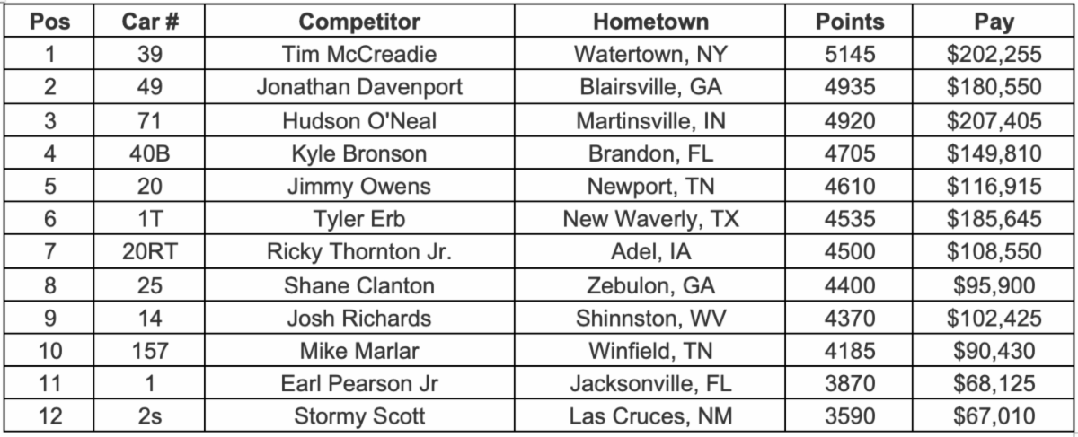 Race StatisticsEntrants: 46Lap Leaders: Jonathan Davenport (Lap 1); Tim McCreadie (Laps 2-40)Wrisco Feature Winner: Tim McCreadieArizona Sport Shirts CJC – Presented by DirtOnDirt Feature Winner: n/aBrandon Ford TV Challenge Feature Winner: Tim McCreadieMargin of Victory: 2.339 secondsStop Tech Brakes Cautions: Debris (Lap 25); Stormy Scott, Ricky Thornton, Jr., Jason Covert, Josh Richards (Lap 25 restart); Gregg Satterlee (Lap 26); Kyle Bronson (Lap 28)Lucas Oil Late Model Dirt Series Provisionals: Mike Marlar; Matt CosnerSeries Emergency Provisionals: N/ATrack Provisional: Ross RobinsonBig River Steel Podium Top 3: Tim McCreadie, Jimmy Owens, Tyler ErbPenske Shocks Top 5: Tim McCreadie, Jimmy Owens, Tyler Erb, Shane Clanton, Hudson O’NealOptima Batteries Hard Charger of the Race: Ross Robinson (Advanced 16 Positions)Midwest Sheet Metal Spoiler Challenge Point Leader: Tim McCreadieHot Rod Processing Most Laps Led: Tim McCreadie (39 Laps)Sunoco Race for Gas Highest Finisher: Jimmy OwensEibach Springs Rookie of the Race: Ricky Thornton Jr.Dirty Girl Racewear Fastest Lap of the Race: Tim McCreadie (Lap 2 – 19.868 seconds)Fast Shafts Tough Break of the Race: Jonathan DavenportOuterwears Crew Chief of the Race: Philip Snellen (Tim McCreadie)ARP Engine Builder of the Race: Cornett Race EnginesMiller Welders Chassis Builder of the Race: Longhorn ChassisDirt Draft Fastest in Hot Laps: Jonathan Davenport (18.736 seconds)Time of Race: 41 minutes 47 seconds Lucas Oil Championship Points: |