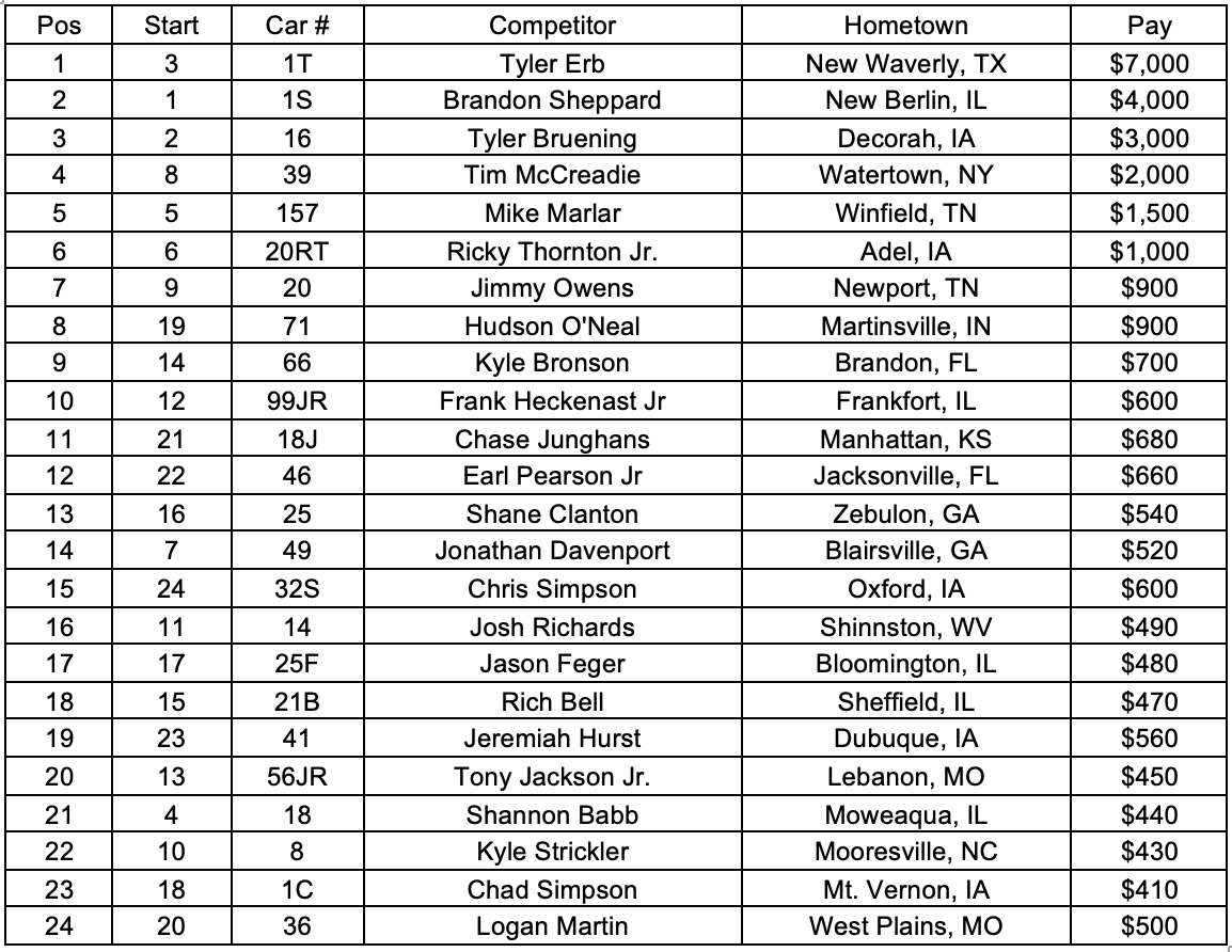 Race StatisticsEntrants: 47Lap Leaders: Brandon Sheppard (Laps 1-2); Tyler Erb (Laps 3-25)Wrisco Feature Winner: Tyler ErbArizona Sport Shirts CJC – Presented by DirtOnDirt Feature Winner: n/aBrandon Ford TV Challenge Feature Winner: Tyler ErbMargin of Victory: 0.910 secondsStop Tech Brakes Cautions: Logan Martin (Lap 17); Kyle Strickler (Lap 19); Shannon Babb (Lap 23)Lucas Oil Late Model Dirt Series Provisionals: n/aSeries Emergency Provisionals: n/aBig River Steel Podium Top 3: Tyler Erb, Brandon Sheppard, Tyler BrueningPenske Shocks Top 5: Tyler Erb, Brandon Sheppard, Tyler Bruening, Tim McCreadie, Mike MarlarOptima Batteries Hard Charger of the Race: Hudson O’Neal (Advanced 11 Positions)Midwest Sheet Metal Spoiler Challenge Point Leader: Tim McCreadieHot Rod Processing Most Laps Led: Tyler Erb (23 Laps)Sunoco Race for Gas Highest Finisher: Tyler ErbEibach Springs Rookie of the Race: Ricky Thornton Jr.Dirty Girl Racewear Fastest Lap of the Race: Tyler Erb (Lap 3 – 20.334 seconds)Fast Shafts Tough Break of the Race: Kyle StricklerOuterwears Crew Chief of the Race: Randall Edwards (Tyler Erb)ARP Engine Builder of the Race: Clements Racing EnginesMiller Welders Chassis Builder of the Race: Rocket ChassisDirt Draft Fastest in Hot Laps: Earl Pearson, Jr. (17.623 seconds)Time of Race: 20 minutes 54 seconds