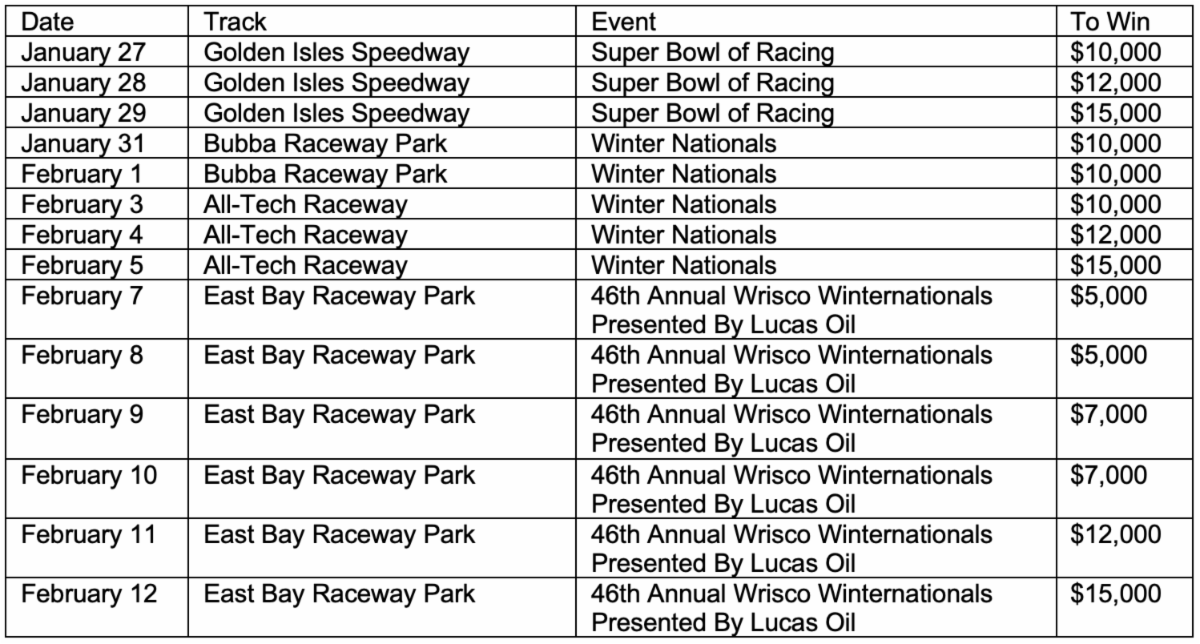 Teams will compete in three nights of competition at Golden Isles Speedway, two nights at Bubba Raceway Park, three nights at All-Tech Raceway, and conclude at East Bay Raceway Park with six nights of racing. If a driver wins all fourteen (14) events during the Wrisco Industries Inc. Winternationals, that driver will earn $145,000 in winnings, in addition to the Ag Protect 1 bonus of $200,000, for a massive total of $345,000.