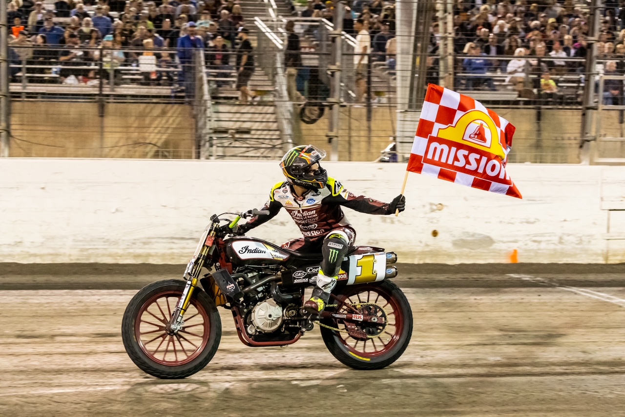 A bobble on Bauman’s part put him out of podium contention, but he was well clear of the pack behind and finished alone in a safe fourth. Some five seconds back, Jarod Vanderkooi (No. 20 Mission Roof Systems Indian FTR750) won out over teammate Brandon Robinson (No. 44 Mission Roof Systems Indian FTR750) in their scrap for fifth.