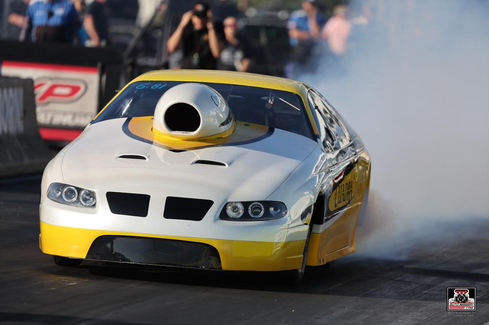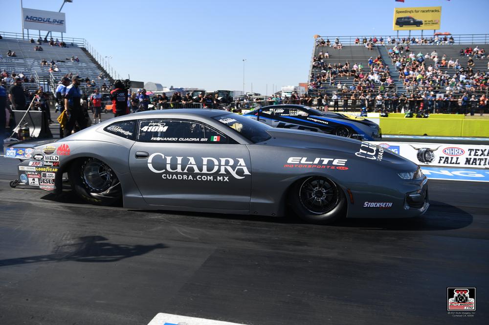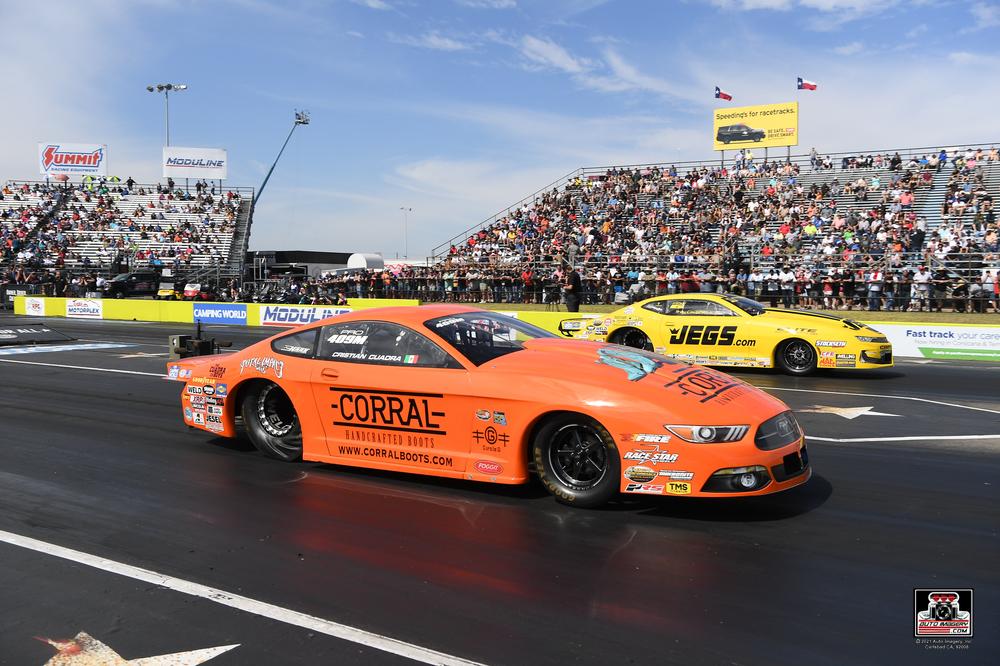 Fernando Cuadra Jr. roars onto the track with a powerful burnout in his Corral Boots Mustang. Photo credit: Auto Imagery Cristian Cuadra lines up against his teammate, Troy Coughlin Jr.. Photo credit: Auto Imagery |