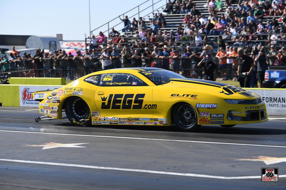 Aaron Stanfield launches his Janac Brothers/JC3 Energy Camaro at the Texas NHRA FallNationals. Photo credit: Auto Imagery Troy Coughlin Jr. rolls up to the line in his JEGS.com / Elite Motorsports Camaro. Photo credit: Auto Imagery |