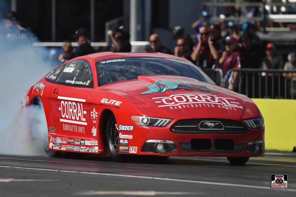 Fernando Cuadra Jr. roars onto the track with a powerful burnout in his Corral Boots Mustang. Photo credit: Auto Imagery