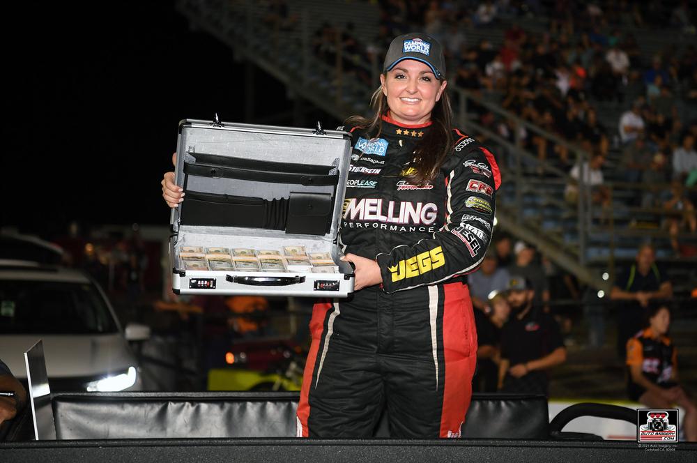 Erica Enders receives her cash bonus for powering to the lowest elapsed time of Friday night qualifying. Photo credit: Auto Imagery