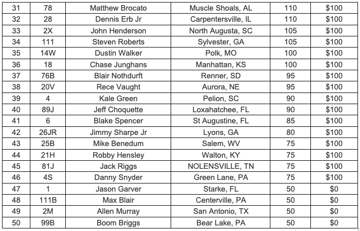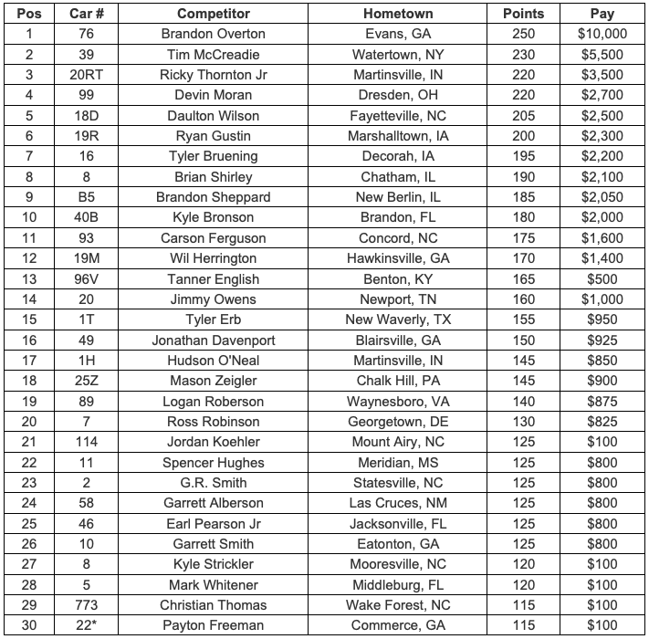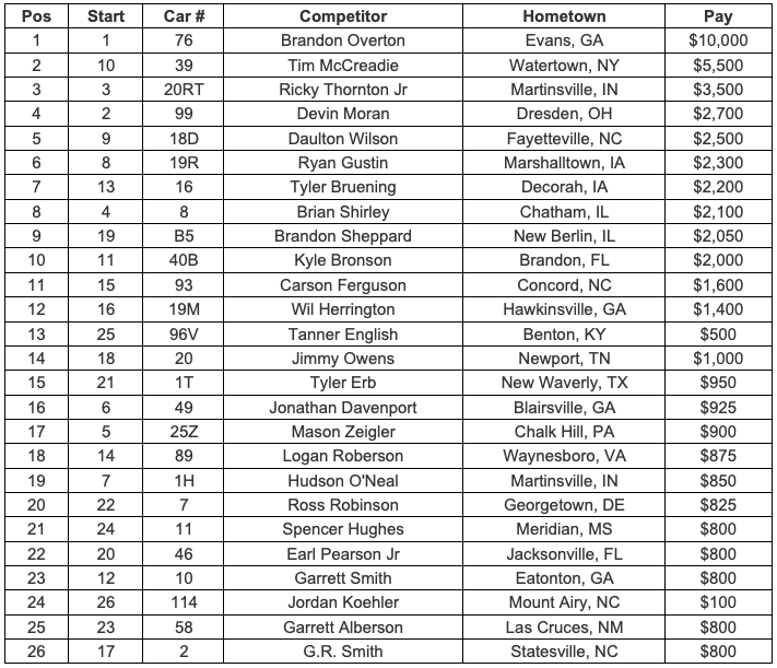 Race Statistics Entrants: 50Terminal Maintenance & Construction Pole Sitter: Brandon OvertonLap Leaders: Brandon Overton (40 Laps)Wieland Feature Winner: Brandon OvertonArizona Sport Shirts Crown Jewel Cup Feature Winner: n/aBrandon Ford TV Challenge Feature Winner: n/aMargin of Victory: 0.402 secondsStop-Tech Brakes Cautions: GR Smith (Lap 2); Jonathan Davenport, Hudson O’Neal (Lap 30); Ross Robinson, Hudson O’Neal, Earl Pearson, Jr., Garrett Alberson, Jordan Koehler (Lap 30 restart)Series Provisionals: Garrett Alberson, Spencer HughesFast Time Provisional: n/aSeries Emergency Provisionals: Tanner English, Jordan KoehlerTrack Provisional: n/aBig River Steel Podium Top 3: Brandon Overton, Tim McCreadie, Ricky Thornton, Jr.Penske Shocks Top 5: Brandon Overton, Tim McCreadie, Ricky Thornton, Jr., Devin Moran, Daulton WilsonTodd Steel Buildings Hard Charger of the Race: Tanner English (Advanced 12 Positions)Wilwood Brakes Lucky 7th Place Finisher: Tyler BrueningEarnhardt Technologies Most Laps Led: Brandon Overton (40 Laps)Sunoco Race for Gas Highest Finisher: Ricky Thornton, Jr.Midwest Sheet Metal Spoiler Challenge Point Leader: Tim McCreadieO’Reilly Auto Parts Rookie of the Race: n/aEtchberger Trucking Fastest Lap of the Race: Brandon Overton (Lap 32 – 15.769 seconds)Outerwears Crew Chief of the Race: Kent Fegter (Brandon Overton)ARP Engine Builder of the Race: Clements Racing EnginesMiller Welders Chassis Builder of the Race: Longhorn ChassisDirt Draft Fastest in Hot Laps: Brandon Sheppard (15.256 seconds)Time of Race: 20 minutes 38 seconds