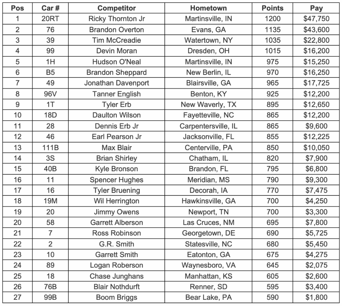 Race Statistics Entrants: 45Terminal Maintenance & Construction Pole Sitter: Shane ClantonLap Leaders: Ricky Thornton, Jr. (Laps 1-7); Shane Clanton (Laps 8-16); Ricky Thornton, Jr. (Laps 17-28); Max Blair (Lap 29); Ricky Thornton, Jr. (Laps 30-50)Wieland Feature Winner: Ricky Thornton, Jr.Arizona Sport Shirts Crown Jewel Cup Feature Winner: n/aBrandon Ford TV Challenge Feature Winner: n/aMargin of Victory: 0.428 secondsStop-Tech Brakes Cautions: Wil Herrington (Lap 29); Earl Pearson, Jr. (Lap 40); Earl Pearson, Jr. (Lap 48); Jonathan Davenport (Lap 48 Restart)Series Provisionals: Garrett Alberson; Ross RobinsonFast Time Provisional: n/aSeries Emergency Provisionals: Jonathan Davenport; Garrett Smith; Logan RobersonTrack Provisional: n/aBig River Steel Podium Top 3: Ricky Thornton, Jr., Tim McCreadie, Brandon SheppardPenske Shocks Top 5: Ricky Thornton, Jr., Tim McCreadie, Brandon Sheppard, Devin Moran, Tyler ErbTodd Steel Buildings Hard Charger of the Race: Tyler Erb (Advanced 16 Positions)Wilwood Brakes Lucky 7th Place Finisher: Max BlairDeatherage Opticians Lucky 13th Place Finisher: Dennis Erb, Jr.Earnhardt Technologies Most Laps Led: Ricky Thornton, Jr. (40 Laps)Sunoco Race for Gas Highest Finisher: Ricky Thornton, Jr.Midwest Sheet Metal Spoiler Challenge Point Leader: Brandon OvertonO’Reilly Auto Parts Rookie of the Race: n/aEtchberger Trucking Fastest Lap of the Race: Ricky Thornton, Jr. (Lap 1 – 19.614 seconds)MD3 Tough Break of the Race: Jonathan DavenportOuterwears Crew Chief of the Race: Anthony Burroughs (Ricky Thornton, Jr.)ARP Engine Builder of the Race: Clements Racing EnginesMiller Welders Chassis Builder of the Race: Longhorn ChassisDirt Draft Fastest in Hot Laps: Hudson O’Neal (18.185 seconds)Time of Race: 29 minutes 21 seconds The Big River Steel Chase for the Championship Presented by ARP Point Standings: |