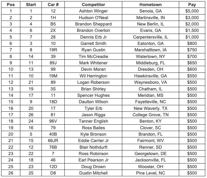 | Race StatisticsEntrants: 60Terminal Maintenance & Construction Pole Sitter: Ashton WingerLap Leaders: Ashton Winger (Laps 1-30)Wieland Feature Winner: Ashton WingerArizona Sport Shirts Crown Jewel Cup Feature Winner: n/aBrandon Ford TV Challenge Feature Winner: n/aMargin of Victory: 1.833 secondsStop-Tech Brakes Cautions: Dustin Mitchell (Lap 8); Eddie Carrier, Jr. (Lap 21); Kyle Bronson (Lap 24)Series Provisionals: n/aWieland Fast Time Provisional: Dustin Mitchell, Jason RiggsSeries Emergency Provisionals: n/aTrack Provisional: n/aBig River Steel Podium Top 3: Ashton Winger, Hudson O’Neal, Brandon SheppardPenske Shocks Top 5: Ashton Winger, Hudson O’Neal, Brandon Sheppard, Brandon Overton, Dennis Erb, Jr.Todd Steel Buildings Hard Charger of the Race: Logan Roberson (Advanced 9 Positions)Wilwood Brakes Lucky 7th Place Finisher: Ryan GustinDeatherage Opticians Lucky 13th Place Finisher: Brian ShirleyEarnhardt Technologies Most Laps Led: Ashton Winger (30 Laps)Sunoco Race for Gas Highest Finisher: Hudson O’Neal Midwest Sheet Metal Spoiler Challenge Point Leader: Ricky Thornton, Jr.O’Reilly Auto Parts Rookie of the Race: n/aEtchberger Trucking Fastest Lap of the Race: Ashton Winger (Lap 13 – 15.355 seconds)MD3 Tough Break of the Race: Kyle BronsonOuterwears Crew Chief of the Race: Gary Winger (Ashton Winger)ARP Engine Builder of the Race: Durham Racing EnginesMiller Welders Chassis Builder of the Race: Rocket ChassisDirt Draft Fastest in Hot Laps: Jensen Ford (14.893 seconds)Time of Race: 14 minutes 42 seconds |