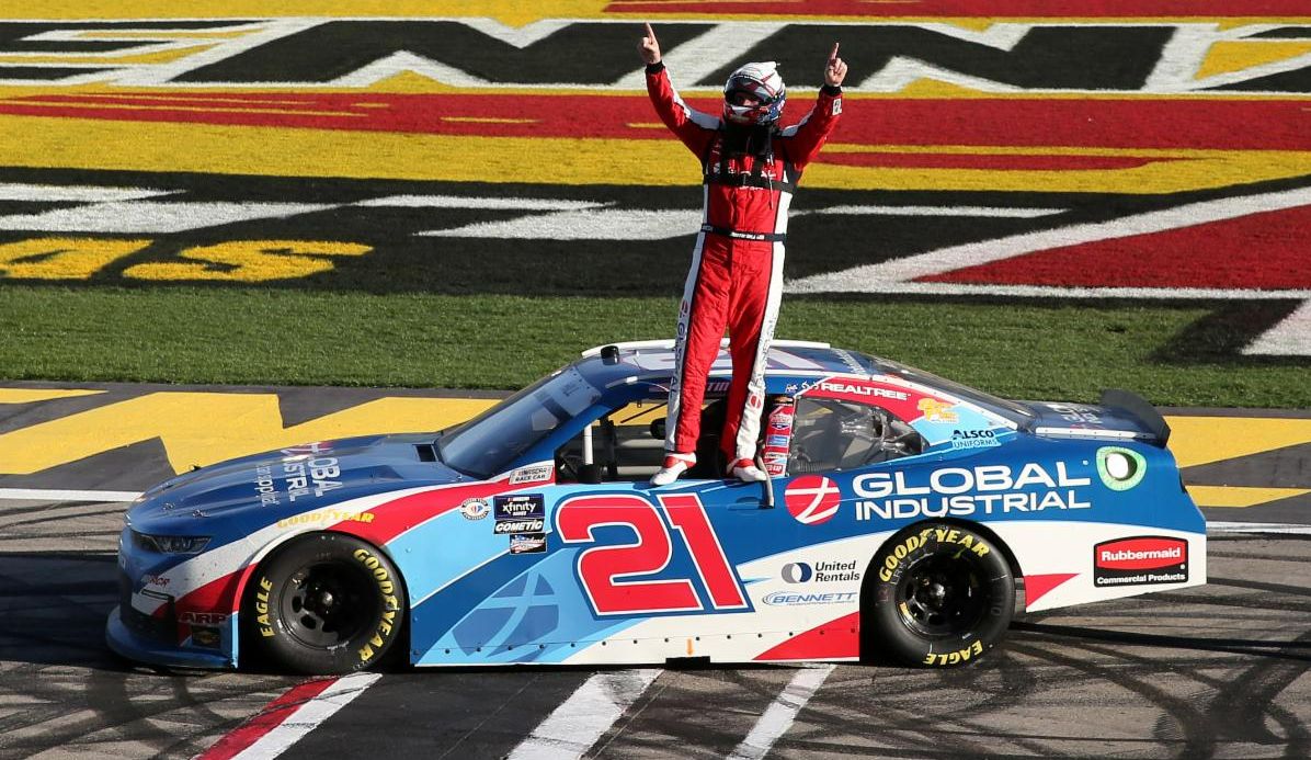 ![]() NXS points leader Austin Hill became the first repeat winner of the season, taking his No. 21 Richard Childress Racing Camaro SS team to victory lane in Saturday’s NXS Alsco Uniforms 300. |