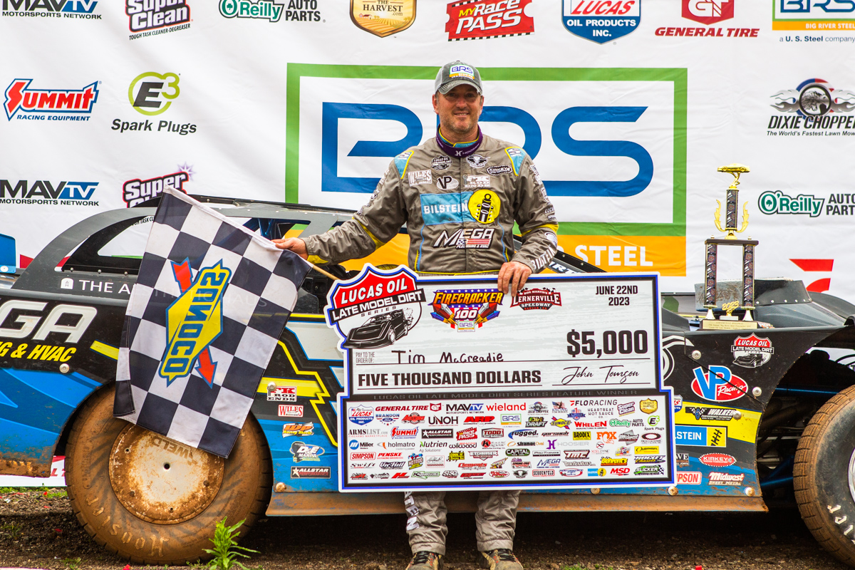 McCreadie’s 35th career Lucas Oil Late Model Dirt Series win came in a caution plagued Group B 25-lapper. “It’s a little treacherous on the cushion and there’s slick spots everywhere. It’s not an easy track to race on. It was probably to my benefit to be out front to be able to see where every little nook and cranny of the cushion is and be smooth. I struggled a little bit in traffic there. Lernerville did a very good job on the track. The place when I got here this morning, I thought maybe it wasn’t even going to be ready. It had a little bit of a cushion but that’s part of racing, but the rest of it’s nice. Hopefully we keep running good.” Hughes continues to edge closer to his first career Lucas Oil Late Model Dirt Series win, surviving a race-long battle with several other drivers to grab the runner-up position. “We just need to keep tuning on it. I wasn’t quite as good up against the cushion there at the end. I was just a little too free. Most of the time I am not that good up on a big curb like that anyway. It was just a real good run for us.” Moran was also in the hotly contested race for a podium spot as he came home in third. “Hudson [O’Neal] messed up right there a little bit at the end. Spencer and Hud were crossing each other over and I just stayed committed to that top. Man, that was a lot of fun. There was a lot of cautions unfortunately, but we were racing all over, it was a blast.” The winner’s Paylor Motorsports, Longhorn Chassis is powered by Cornett Racing Engine and sponsored by Mega Plumbing of the Carolinas, Racing for Heroes, Bilstein Shocks, Armslist.com, Baker Mitchell Company Integrous Risk Solutions, Brad Benton Trucking Inc., and The Aesthetic Haus. Completing the top ten in the second feature were Ross Robinson, Garrett Alberson, Kyle Strickler, Chub Frank, and Alex Ferree. Lucas Oil Late Model Dirt Series Race Summary 17th Annual Firecracker 100 Presented by Big River Steel Night #1Thursday, June 22, 2023Lernerville Speedway – Sarver, PA Allstar Performance Time TrialsFast Time Group A: Jonathan Davenport | 15.155 seconds (overall)Fast Time Group B: Spencer Hughes | 15.494 seconds Penske Shocks Heat Race #1 – Group A Finish (8 Laps, All Transfer): 1. 49-Jonathan Davenport[1]; 2. 10-Michael Norris[3]; 3. 16-Tyler Bruening[4]; 4. 11T-Trevor Collins[5]; 5. 55C-Chris Schneider[7]; 6. 25S-Cory Sines[8]; 7. 22-Gregg Satterlee[2]; 8. 9-Breyton Santee[6]; 9. 11P-Joshua Powell[9] Summit Racing Products Heat Race #2 – Group A Finish (8 Laps, All Transfer): 1. 25Z-Mason Zeigler[2]; 2. 20RT-Ricky Thornton Jr[1]; 3. 46-Earl Pearson Jr[4]; 4. 1T-Tyler Erb[3]; 5. 1Z-Logan Zarin[5]; 6. 48-Colton Flinner[9]; 7. B22-Bump Hedman[8]; 8. 10L-Gary Lyle[7]; 9. 10K-Zachary Kane[6] Simpson Race Products Heat Race #3 – Group A Finish (8 Laps, All Transfer): 1. 76-Brandon Overton[2]; 2. 111B-Max Blair[1]; 3. 99B-Boom Briggs[3]; 4. J4-John Garvin Jr[4]; 5. 29-Ken Schaltenbrand[5]; 6. 22B-Darrell Bossard[6]; 7. 96-Mike Smith[7]; 8. 20N-Nicholas Eck[8] Penske Shocks Heat Race #1 – Group B Finish (8 Laps, Top 4 Transfer): 1. 39-Tim McCreadie[2]; 2. 11-Spencer Hughes[1]; 3. 7-Ross Robinson[4]; 4. 1C-Alex Ferree[3]; 5. 1*-Chub Frank[6]; 6. 77-Tyler Dietz[5]; 7. 66-Todd Bachman[8]; 8. 01-Ron Hall[9]; 9. 20D-Doug Eck[7] Summit Racing Products Heat Race #2 – Group B Finish (8 Laps, All Transfer): 1. 15K-Cody Overton[4]; 2. 99-Devin Moran[2]; 3. 4S-Ryan Montgomery[5]; 4. 55-Benji Hicks[3]; 5. 8K-Kyle Strickler[1]; 6. 14-Braeden Dillinger[6]; 7. 97-Kevin Smith[8]; 8. (DNS) 184-Kyle Lukon Simpson Race Products Heat Race #3 – Group B Finish (8 Laps, All Transfer): 1. 1H-Hudson O’Neal[1]; 2. 18D-Daulton Wilson[3]; 3. 9Y-Levi Yetter[2]; 4. 3RK-Daryl Charlier[5]; 5. 58-Garrett Alberson[4]; 6. AUS1-Brent Vosbergen[7]; 7. 14A-Dan Angelicchio[6]; 8. 1L-Chuckie Lepsch[8] 17th Annual Firecracker 100 Presented by Big River Steel Group A Feature Finish (25 Laps): |
