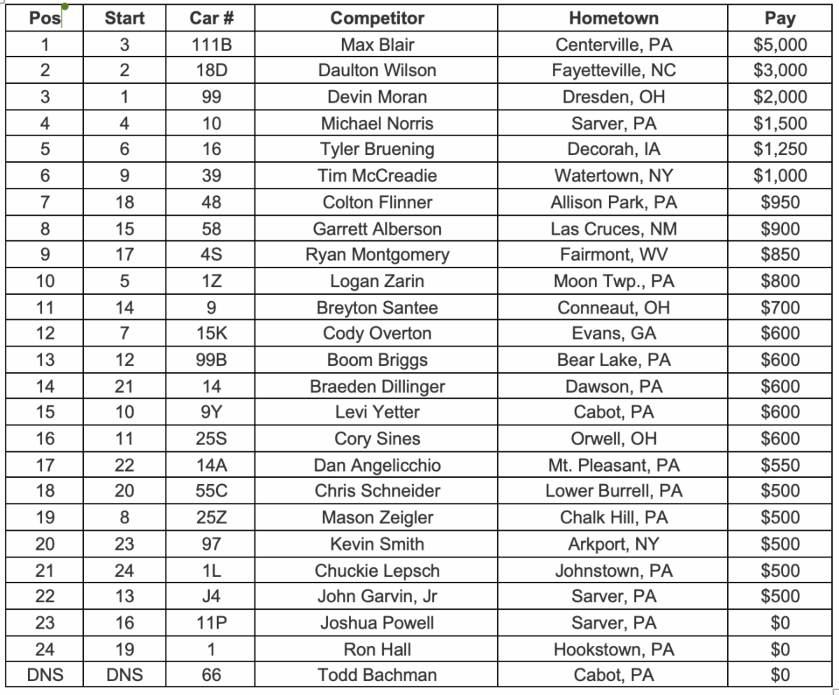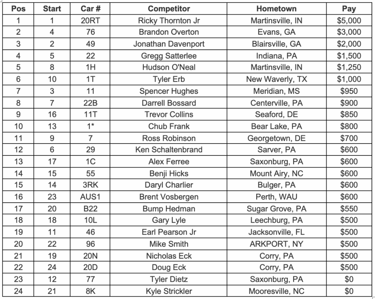 Race Statistics Entrants: 48Group A Terminal Maintenance & Construction Pole Sitter: Ricky Thornton, Jr.Group B Terminal Maintenance & Construction Pole Sitter: Devin MoranGroup A Lap Leaders: Ricky Thornton, Jr. (Laps 1-21); Jonathan Davenport (Lap 22); Ricky Thornton, Jr. (Laps 23-25)Group B Lap Leaders: Devin Moran (Laps 1-19); Max Blair (Laps 20-25)Group A Wieland Feature Winner: Ricky Thornton, Jr.Group B Wieland Feature Winner: Max BlairArizona Sport Shirts Crown Jewel Cup Feature Winner: n/aBrandon Ford TV Challenge Feature Winner: n/aGroup A Margin of Victory: 1.886 secondsGroup B Margin of Victory: 1.149 secondsGroup A Gorsuch Performance Solutions Cautions: Nicholas Eck (Lap 19); Earl Pearson, Jr. (Lap 20)Group B Gorsuch Performance Solutions Cautions: Dan Angelicchio (Lap 1); Jared Miley (Lap 2); Chuckie Lepsch (Lap 7); John Garvin (Lap 12)Series Provisionals: n/aFast Time Provisional: n/aSeries Emergency Provisionals: n/aTrack Provisional: n/aGroup A Big River Steel Podium Top 3: Ricky Thornton, Jr., Brandon Overton, Jonathan DavenportGroup B Big River Steel Podium Top 3: Max Blair, Daulton Wilson, Devin MoranGroup A Penske Shocks Top 5: Ricky Thornton, Jr., Brandon Overton, Jonathan Davenport, Gregg Satterlee, Hudson O’NealGroup B Penske Shocks Top 5: Max Blair, Daulton Wilson, Devin Moran, Michael Norris, Tyler BrueningGroup A Todd Steel Buildings Hard Charger of the Race: Tyler Collins (Advanced 7 Positions)Group B Todd Steel Buildings Hard Charger of the Race: Colton Flinner (Advanced 11 Positions)Group A Wilwood Brakes Lucky 7th Place Feature: Spencer HughesGroup B Wilwood Brakes Lucky 7th Place Feature: Colton FlinnerGroup A Deatherage Opticians Lucky 13th Place Feature: Alex FerreeGroup B Deatherage Opticians Lucky 13th Place Feature: Boom BriggsGroup A Earnhardt Technologies Most Laps Led: Ricky Thornton, Jr. (24 Laps)Group B Earnhardt Technologies Most Laps Led: Devin Moran (19 Laps)Group A Sunoco Race for Gas Highest Finisher: Ricky Thornton, Jr.Group A Sunoco Race for Gas Highest Finisher: Garrett AlbersonMidwest Sheet Metal Spoiler Challenge Point Leader: Ricky Thornton, Jr.O’Reilly Auto Parts Rookie of the Race: Max BlairGroup A Etchberger Trucking Fastest Lap of the Race: Ricky Thornton, Jr. (Lap 2 – 15.849 seconds)Group B Etchberger Trucking Fastest Lap of the Race: Max Blair (Lap 2 – 16.479 seconds)Group A MD3 Tough Break of the Race: Earl Pearson, Jr.Group B MD3 Tough Break of the Race: Mason ZeiglerGroup A Outerwears Crew Chief of the Race: Anthony Burroughs (Ricky Thornton, Jr.)Group B Outerwears Crew Chief of the Race: Rob Blair (Max Blair)Group A ARP Engine Builder of the Race: Clements Racing EnginesGroup B ARP Engine Builder of the Race: Clements Racing EnginesGroup A Miller Welders Chassis Builder of the Race: Longhorn ChassisGroup B Miller Welders Chassis Builder of the Race: Rocket ChassisDirt Draft Fastest in Hot Laps: Max Blair (15.399 seconds)Group A Time of Race: 17 minutes 02 secondsGroup B Time of Race: 19 minutes 48 seconds