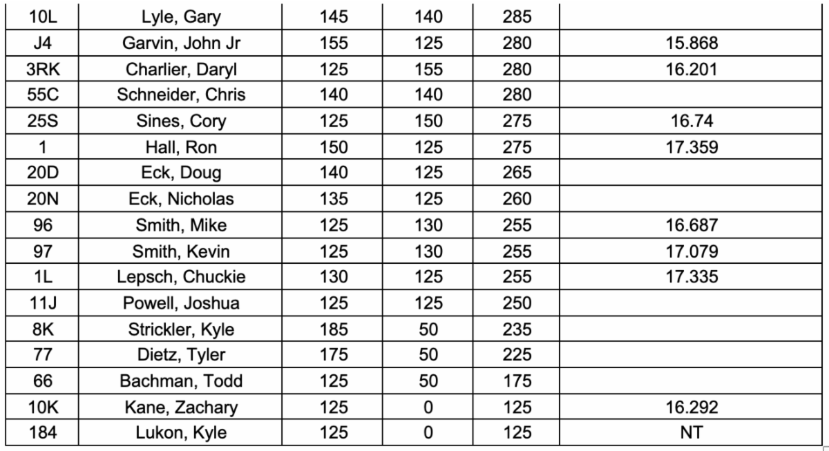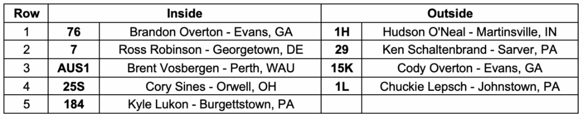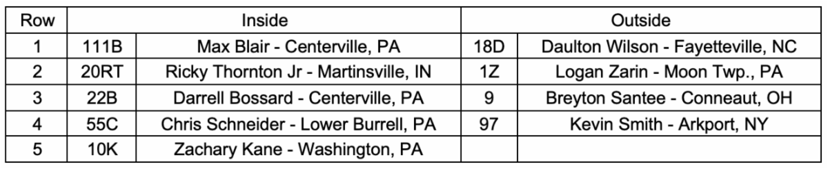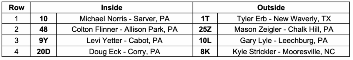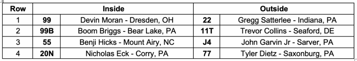 Simpson Race Products Heat Race #3 – Group A Finish (8 Laps, All Transfer): 1. 11-Spencer Hughes[1]; 2. 29-Ken Schaltenbrand[2]; 3. 7-Ross Robinson[3]; 4. 77-Tyler Dietz[6]; 5. 55-Benji Hicks[8]; 6. 10L-Gary Lyle[5]; 7. 8K-Kyle Strickler[4]; 8. 20D-Doug Eck[7] Penske Shocks Heat Race #1 – Group B Finish (8 Laps, Top 4 Transfer): 1. 99-Devin Moran[2]; 2. 10-Michael Norris[1]; 3. 15K-Cody Overton[3]; 4. 9Y-Levi Yetter[4]; 5. J4-John Garvin Jr[5]; 6. 11P-Joshua Powell[6]; 7. 01-Ron Hall[7]; 8. 14A-Dan Angelicchio[8]