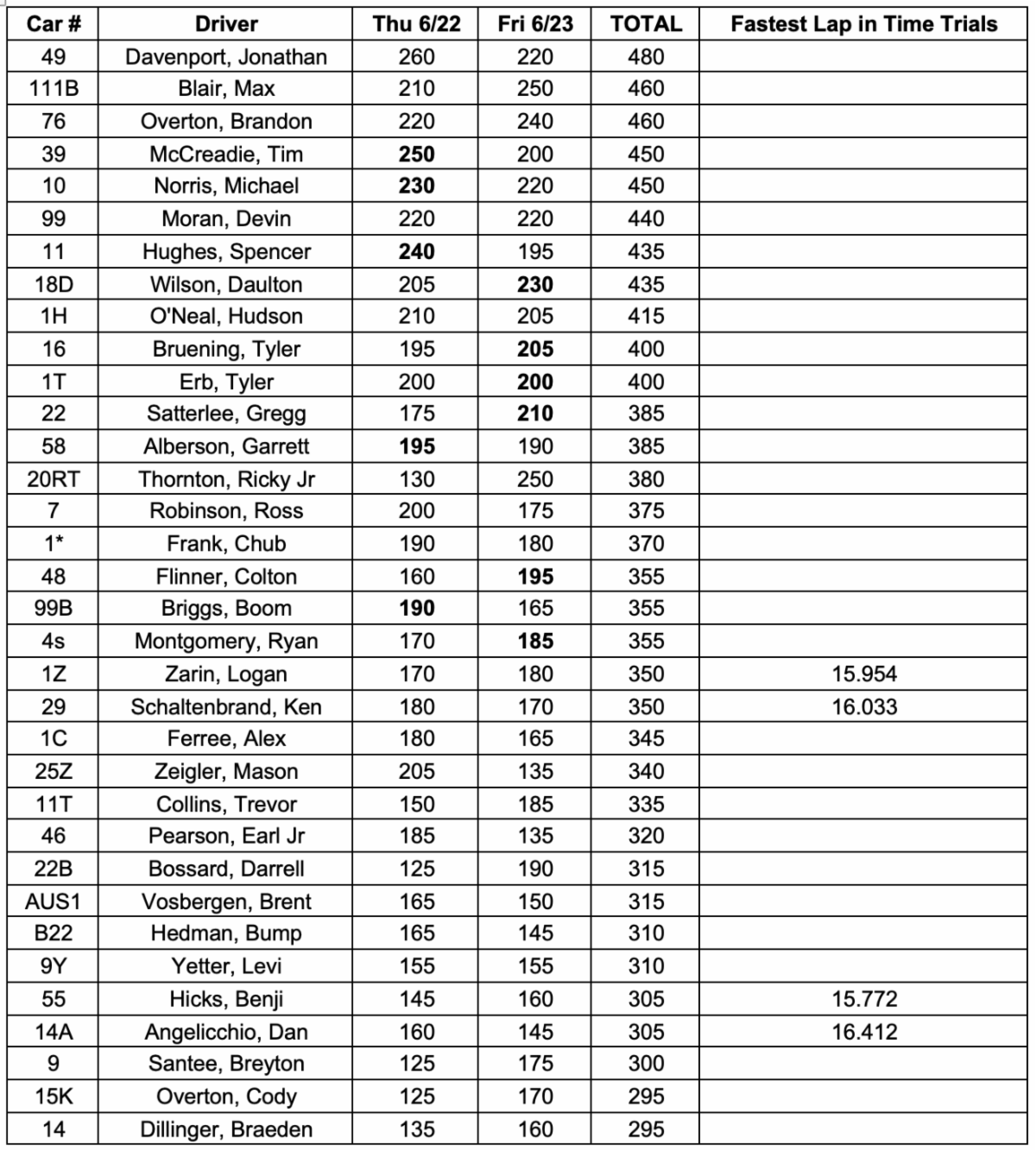 17th Annual Firecracker 100 Presented by Big River Steel Point Standings