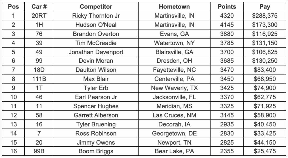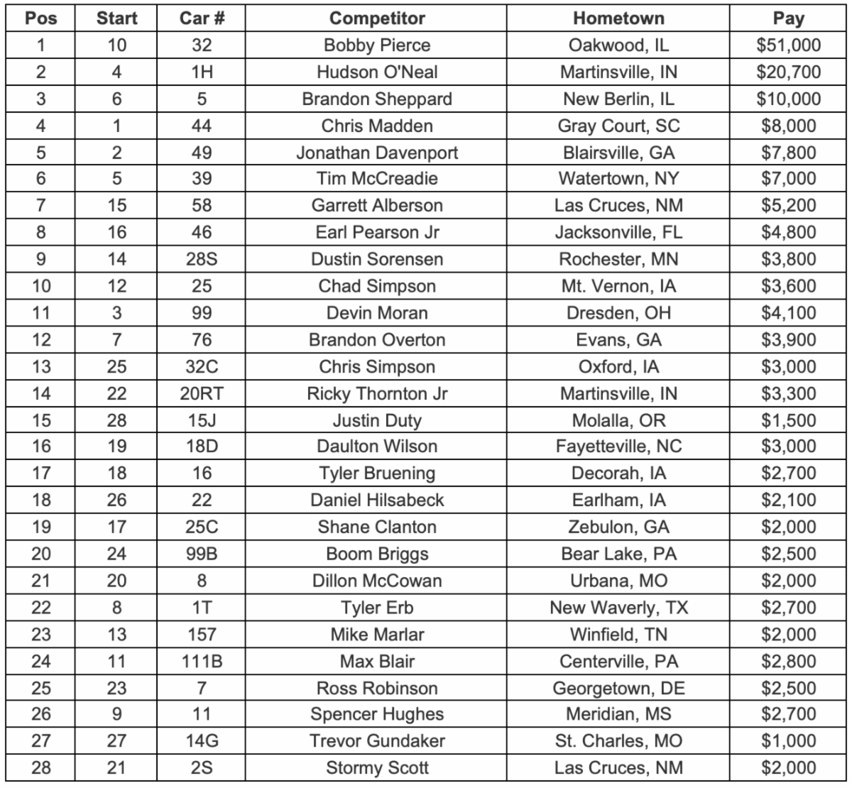 Race Statistics Entrants: 38Terminal Maintenance & Construction Pole Sitter: Chris Madden Lap Leaders: Chris Madden (Laps 1-36); Hudson O’Neal (Laps 37-74); Bobby Pierce (Lap 75)Wieland Feature Winner: Bobby PierceArizona Sport Shirts Crown Jewel Cup Feature Winner: Bobby PierceBrandon Ford TV Challenge Feature Winner: Bobby PierceMargin of Victory: 0.002 secondsGorsuch Performance Solutions Cautions: Stormy Scott (Lap 18); Spencer Hughes (Lap 26); Shane Clanton (Lap 35); Ross Robinson (Lap 37); Max Blair (Lap 38); Tyler Erb (Lap 41); Dillon McCowan (Lap 48); Devin Moran (Lap 55); Ricky Thornton, Jr. (Lap 65)LOLMDS Provisionals: Ross Robinson; Boom BriggsLOLMDS Emergency Provisionals: n/aMLRA Provisionals: Chris Simpson; Daniel HilsabeckMLRA Emergency Provisionals: Trevor Gundaker; Justin DutyTrack Provisional: n/aBig River Steel Podium Top 3: Bobby Pierce, Hudson O’Neal, Brandon SheppardPenske Shocks Top 5: Bobby Pierce, Hudson O’Neal, Brandon Sheppard, Chris Madden, Jonathan DavenportTodd Steel Buildings Hard Charger of the Race: Justin Duty (Advanced 13 Positions)Wilwood Brakes Lucky 7th Place Feature: Garrett AlbersonDeatherage Opticians Lucky 13th Place Feature: Chris SimpsonEarnhardt Technologies Most Laps Led: Hudson O’Neal (38 Laps)Sunoco Race for Gas Highest Finisher: Hudson O’NealMidwest Sheet Metal Spoiler Challenge Point Leader: Ricky Thornton, Jr.O’Reilly Auto Parts Rookie of the Race: Max BlairEtchberger Trucking Fastest Lap of the Race: Chris Madden (Lap 8 – 14.485 seconds)MD3 Tough Break of the Race: Ricky Thornton Jr. Outerwears Crew Chief of the Race: Bob Pierce (Bobby Pierce)ARP Engine Builder of the Race: Vic Hill Racing EnginesMiller Welders Chassis Builder of the Race: Longhorn ChassisDirt Draft Fastest in Hot Laps: Ricky Thornton, Jr. (14.567 seconds)Time of Race: 42 minutes 49 seconds The Big River Steel Chase for the Championship Presented by ARP Point Standings: |