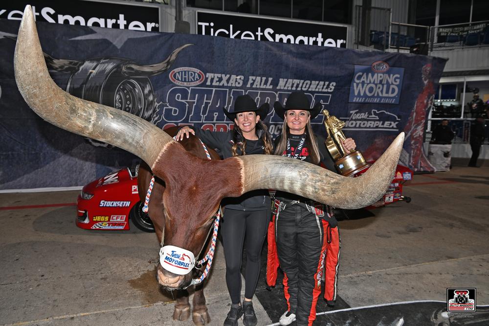 Erica Enders and her sister Courtney celebrate her 47th career win with Oliver the Watusi. (Photo credit: Auto Imagery)