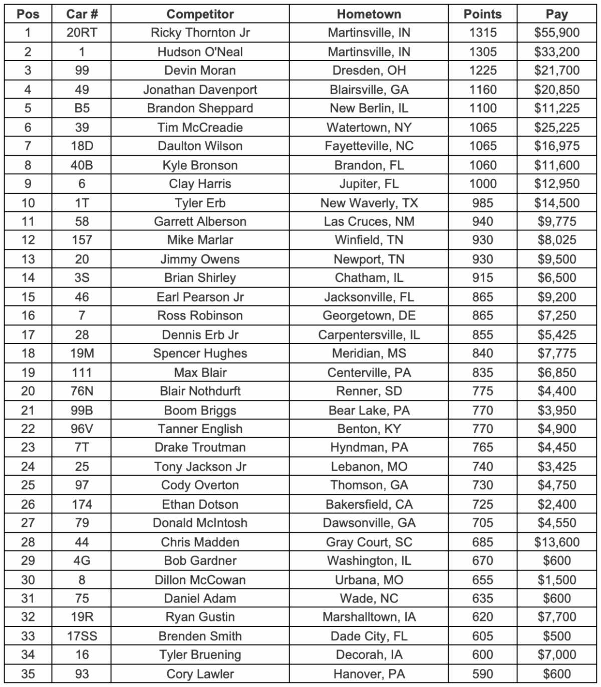 Race Statistics Entrants: 47Victory Fuel Pole Sitter: Daulton WilsonLap Leaders: Tim McCreadie (Laps 1-50)Wieland Feature Winner: Tim McCreadieArizona Sport Shirts Crown Jewel Cup Feature Winner: n/aBrandon Ford TV Challenge Feature Winner: n/aMargin of Victory: 2.456 seconds Dave Warren Powersports Cautions: Mike Marlar (Lap 26)Series Provisionals: Hudson O’Neal; Tyler ErbFast Time Provisional: n/aSeries Emergency Provisionals: Max Blair; Earl Pearson, Jr.; Brandon Sheppard; Garrett AlbersonTrack Provisional: n/aBig River Steel Podium Top 3: Tim McCreadie, Daulton Wilson, Ryan GustinPenske Shocks Top 5: Tim McCreadie, Daulton Wilson, Ryan Gustin, Tyler Bruening, Clay HarrisTodd Steel Buildings Hard Charger of the Race: Brandon Sheppard (Advanced 19 Positions) Wilwood Brakes Lucky 7th Place Feature: Kyle BronsonDeatherage Opticians Lucky 13th Place Feature: Chris MaddenMD3 Most Laps Led: Tim McCreadie (50 Laps) Sunoco Race for Gas Highest Finisher: Tim McCreaideMidwest Sheet Metal Spoiler Challenge Point Leader: Ricky Thornton, Jr.O’Reilly Auto Parts Rookie of the Race: n/a Coltman Farms Fastest Lap of the Race: Tim McCreadie (Lap 2 – 18.053 seconds) Slicker Graphics Slickest Move of the Race: Tim McCreadieMiller Welders Hard Luck Award: Ricky Thornton, Jr.Outerwears Crew Chief of the Race: Scott Fegter (Tim McCreadie)ARP Engine Builder of the Race: Cornett Racing EnginesMiller Welders Chassis Builder of the Race: Longhorn ChassisDirt Draft Fastest in Hot Laps: Cody Overton (18.488 seconds)Time of Race: 19 minutes 14 seconds Big River Steel Chase for the Championship Presented by ARP Point Standings: |