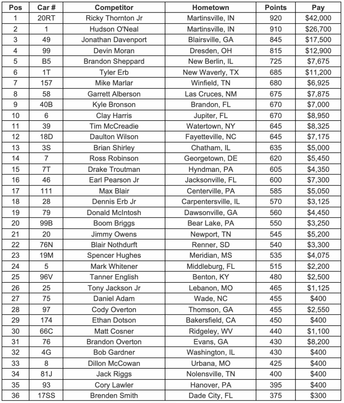Race Statistics Entrants: 43Victory Fuel Pole Sitter: Hudson O’NealLap Leaders: Hudson O’Neal (Laps 1-7); Clay Harris (Laps 8-17); Hudson O’Neal (Laps 18-40)Wieland Feature Winner: Hudson O’NealArizona Sport Shirts Crown Jewel Cup Feature Winner: n/aBrandon Ford TV Challenge Feature Winner: n/aMargin of Victory: 1.093 seconds Dave Warren Powersports Cautions: Tanner English (Lap 8); Blair Nothdurft (Lap 8 Restart); Drake Troutman, Mike Marlar (Lap 9); Tony Jackson, Jr., Garrett Alberson (Lap 10); Donald McIntosh, Mike Marlar, Mark Whitener (Lap 10 Restart)Series Provisionals: Devin Moran; Tyler ErbFast Time Provisional: n/aSeries Emergency Provisionals: Max Blair, Spencer Hughes, Ross Robinson, Bob Gardner Track Provisional: n/aBig River Steel Podium Top 3: Hudson O’Neal, Clay Harris, Brian ShirleyPenske Shocks Top 5: Hudson O’Neal, Clay Harris, Brian Shirley, Ricky Thornton, Jr., Kyle BronsonTodd Steel Buildings Hard Charger of the Race: Devin Moran (Advanced 17 Positions) Wilwood Brakes Lucky 7th Place Feature: Ashton WingerDeatherage Opticians Lucky 13th Place Feature: Boom BriggsMD3 Most Laps Led: Hudson O’Neal (30 Laps) Sunoco Race for Gas Highest Finisher: Hudson O’NealMidwest Sheet Metal Spoiler Challenge Point Leader: Ricky Thornton, Jr.O’Reilly Auto Parts Rookie of the Race: n/a Coltman Farms Fastest Lap of the Race: Hudson O’Neal (Lap 1 – 15.176 seconds) Slicker Graphics Slickest Move of the Race: Hudson O’NealMiller Welders Hard Luck Award: Blair NothdurftOuterwears Crew Chief of the Race: Danny White (Hudson O’Neal) ARP Engine Builder of the Race: Durham Racing EnginesMiller Welders Chassis Builder of the Race: Rocket ChassisDirt Draft Fastest in Hot Laps: Devin Moran (14.159 seconds)Time of Race: 31 minutes 35 seconds Big River Steel Chase for the Championship Presented by ARP Point Standings: |