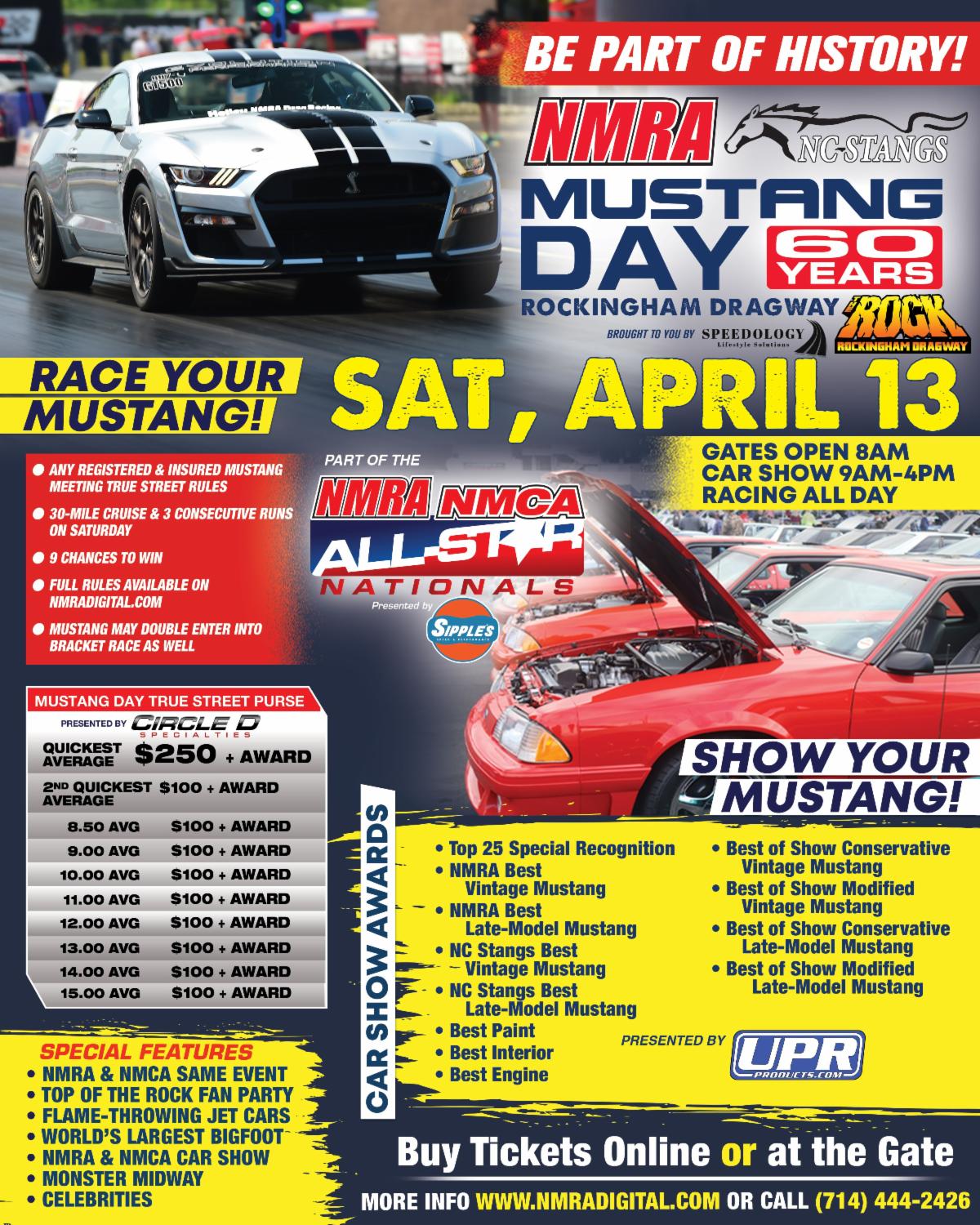 Every April fans across the world celebrate the birthday of Ford’s original pony car on Global Mustang Day. This year, that milestone 60th birthday falls on a Wednesday, so NMRA’s kicking off the celebration early with Mustang Day Presented by NC Stangs and Speedology at the NMRA/NMCA All-Star Nationals held at Rockingham Dragway in Rockingham, NC, on Saturday, April 13th. While Mustang Day is specifically on Saturday the entire NMRA/NMCA event runs April 11-14, 2024. NMRA racers join forces with their NMCA counterparts in mid-April at Rockingham Dragway in Rockingham, NC, for the NMRA/NMCA All-Star Nationals Presented by Sipple’s Speed & Performance, where the Mustang Day celebration will take place atop the famed Top of the Rock above the drag strip and around the facility. In addition to joining the UPR Products Car Show celebrating Mustang Day, enthusiasts are welcome to join in on the racing action in Mustang True Street presented by Circle D Specialties or other classes that might fit their cars. The first 500 Mustang Day participants (show or race) will each receive a collectible Mustang 60 Years license plate, lanyard and credential. Additionally, attendees can enjoy the Top of the Rock Fan Party, flame-throwing jet dragsters, the world’s largest BIGFOOT monster truck, and more.![]() |