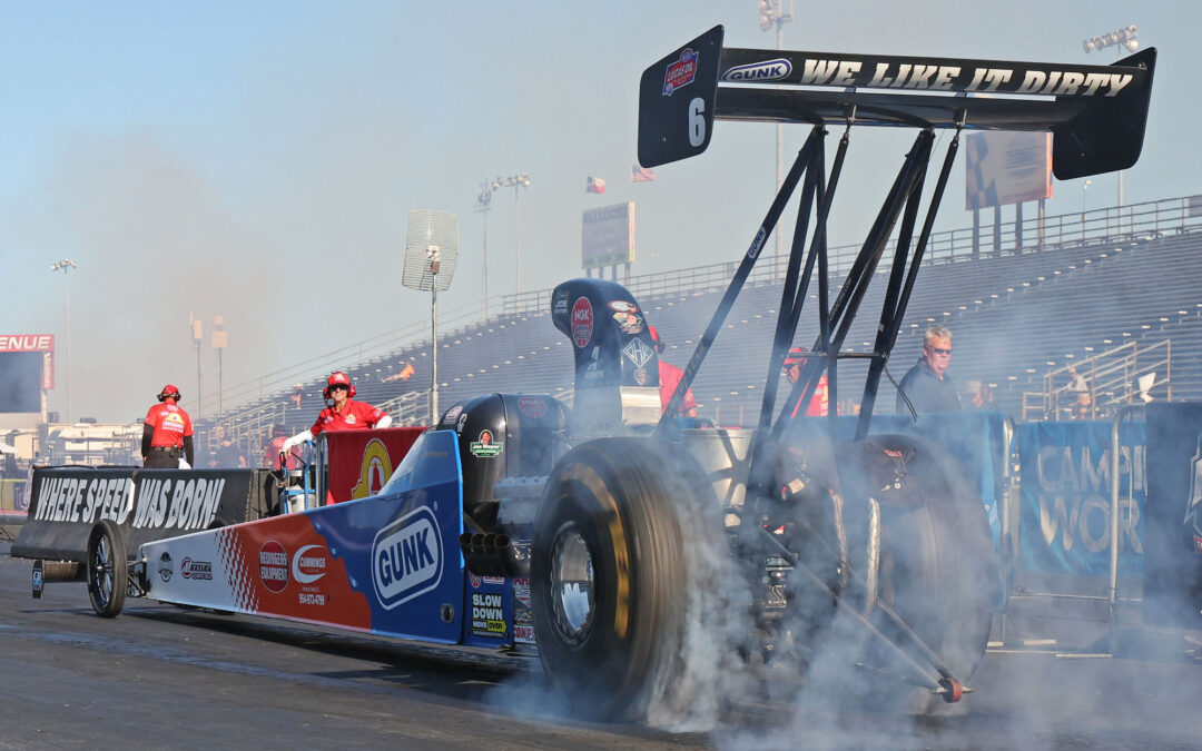 The highlight of the weekend came during Saturday’s JEGS AllStars competition, where Matt Cummings drove the GUNK dragster to the final round in his first season with Randy Meyer Racing. Cummings advanced past teammate Julie Nataas in the opening round after she lost traction early, then defeated Jared Dreher in the semifinals with a 5.25-second pass at 275 mph before falling just short in the final against Joey Severance.