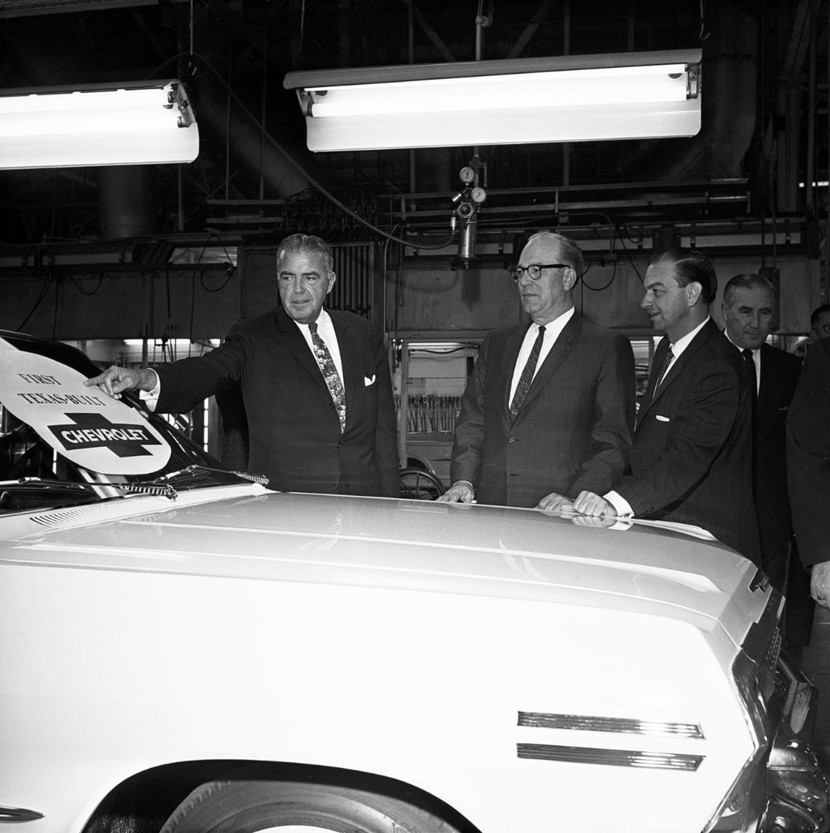 Just south of the 2.73-mile, 14-turn Arlington street circuit, across Texas Highway 180, sits Arlington Assembly, a General Motors plant that employs over 5,000 people and produces approximately 1,300 vehicles per day. Groundbreaking for the then 1.5-million-square-foot, now 4.375-million-square-foot plant took place in 1952, with the first vehicle rolling off the line in 1954. Over the 70+ years, more than 14 million vehicles, including Buick, Chevrolet, Cadillac, GMC, Oldsmobile, and Pontiac models, have rolled out of the massive facility. The first Chevrolet rolls off the assembly line in Arlington, Texas (Rights held by The University of Texas at Arlington Libraries, Special Collections)