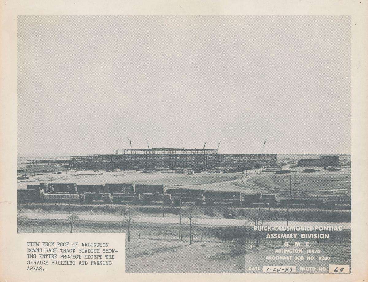 The view of construction on the Arlington Assembly plant from the roof of the grandstand at Arlington Downs Raceway (Rights held by The University of Texas at Arlington Libraries, Special Collections)