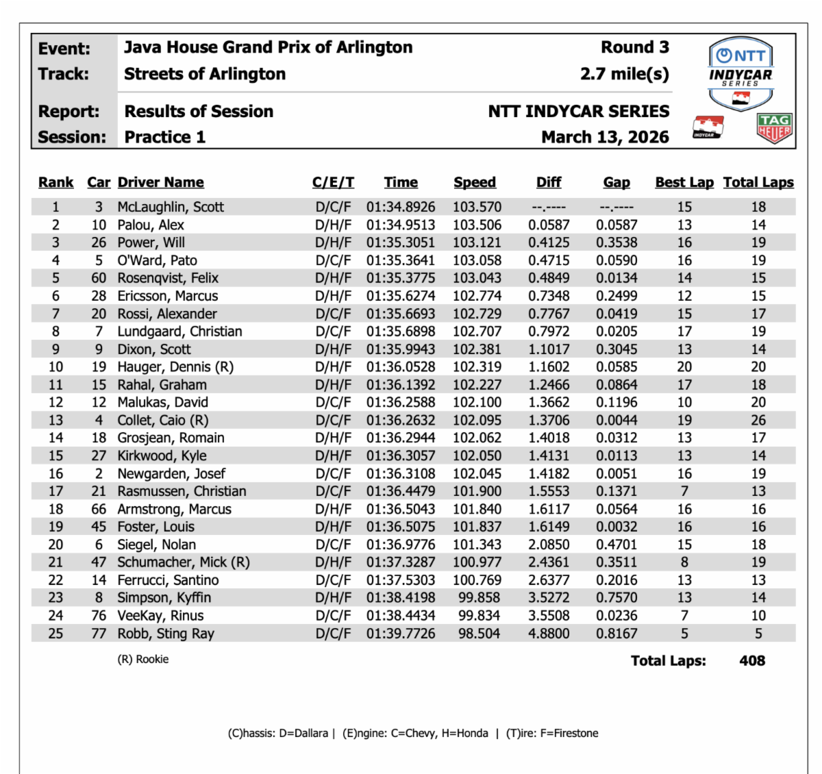Two of the top three in the second 12-minute session on the Reds were Chevrolet-powered drivers, with Rossi and Lundgaard setting the second and third-best times.Combined Friday Practice Times at the Java House Grand Prix of ArlingtonNTT INDYCAR SERIES News ConferenceFriday, March 13, 2026Scott McLaughin