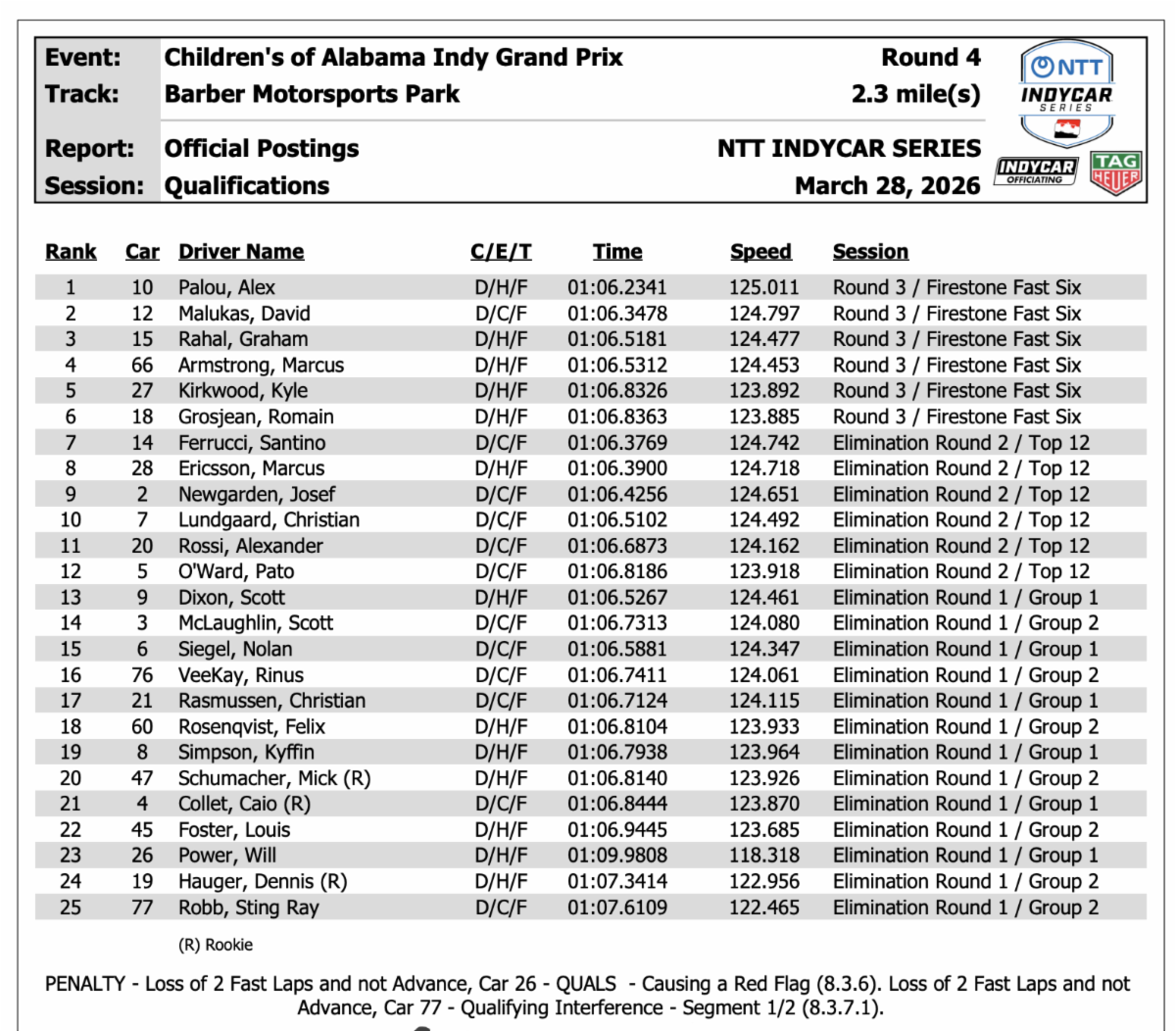| CHEVROLET IN THE NTT INDYCAR SERIES Children’s of Alabama Indy Grand Prix2.3-mile, 17-turn Barber Motorsports Park natural terrain road courseBirmingham, AlabamaSaturday Qualifying ReportMarch 28, 2026 BIRMINGHAM, Alabama (March 28, 2026) – David Malukas will start the Children’s of Alabama Indy Grand Prix on the outside of the front row in the No. 12 Verizon Team Penske Chevrolet, improving his average starting position on the season to 4.3, tied for the series lead with today’s pole winner Álex Palou. Santino Ferrucci in the No. 14 Homes For Our Troops Chevrolet, Josef Newgarden in the No. 2 PPG Team Penske Chevrolet, and Christian Lundgaard in the No. 7 VELO Arrow McLaren Chevrolet were the other Chevrolet-powered drivers to qualify in the top ten. Children’s of Alabama Indy Grand Prix Qualifying Results: A crazy few hours for McLaughlin and Team PenskeMcLaughlin, the driver of the No. 3 Odyssey Battery Team Penske Chevrolet dropped the right rear in Turn 1 at Barber Motorsports Park, spinning 180 degrees and impacting the tire and foam barrier and ending up halfway through the catch fence. McLaughlin was seen and released by INDYCAR Medical. He told the INDYCAR Radio Network: “I just dropped the right rear, unfortunately. It’s a testament to the safety of the INDYCAR and what Barbers has done here. Honestly, I think the crash looked a lot worse than it felt. I hope we can get this thing fixed and go out and ship it again in qualifying. I knew the impact was coming, so I tried to brace myself, and then I ended up halfway through the fence, so it was pretty exciting. I’m sad for my guys. I’ve got the best crew on pit land, and they’ll fix it as fast as they can. It’s a shame.” The team made a quick decision to go to the backup car, swapping the undamaged Chevy Indy V6, and replacing the damaged parts, getting the car already wrapped for the Streets of Long Beach, prepared in plenty of time for qualifying. “We’re race drivers,” said McLaughlin to Harvey before qualifying. “You’re paid to push the limits. It’s what you have to do. I have full confidence in the car. I felt really good on that run, it was just a small error with big consequence. It looked pretty crazy, right. For me, it’s just business as usual. Just get in this Odyssey Battery Chevy, feel it for the first lap and send it.” McLaughlin, in the second group, barely missed out on advancing to the Fast 12, with a lap that was only one-hundredth of a second behind O’Ward, saying after qualifying: “First off, massive thanks to the Odyssey Battery Chevy team. I put us behind with the big shunt in practice and these guys just always answer the bell. Can’t thank them enough for their hard work. It was great just to be able to get out for qualifying and if we are in the first group I think we sail through. Really proud of the effort.”What they’re saying – qualifying: David Malukas, No. 12 Verizon Team Penske Chevrolet qualified:“I’m satisfied for sure, but I think it still hurts because we could have gone for the pole. It was so close between me, Palou and Kirkwood, especially in that Fast 12; I couldn’t believe how tight it was. Overall, we did well. I made a call there in the Fast Six, and we definitely overstepped it on the car. I thought in my head, this is going to be perfect. I went a few corners and said man, I overdid it, so that’s on me. I wanted to be aggressive on the set-up. Overall, this Verizon Team Penske Chevrolet has been awesome. From Practice One, we’ve been on such a good streak and really happy that we can start on that front row and keep this consistency we’ve had in 2026 going.” Santino Ferrucci, No. 14 Homes For Our Troops Chevrolet qualified 7th:“Honestly, one of our new things this year is try and start with the car we rolled out with and just build on it. We had it, we’ve been missing time in Turn 12 & 13, and it’s been on me to fix that. And, I just kind of sent it through (Turn) 13 and I think I sent it too far because I passed the line off the track. It sucks, because that what cost us sixth. I can’t thank everybody at A.J. Foyt Racing, HFOT.org and Chevy. We’ve come a long way in the last few years. We’re trying to make this the new normal. We made the Fast 12 in Arlington and almost in the Fast Six this weekend. We’ve had great race cars, but I just want to pass less cars. I like being the pass master, but it feels good to start up front.” Josef Newgarden, No. 2 PPG Team Penske Chevrolet qualified 9th: Christian Lundgaard, No. 7 VELO Arrow McLaren Chevrolet qualified 10th:“Qualifying was disappointing. We had a lot more going into it than where we ended up. Overall, pace in Q1 was good; pace in Q2 was not quite there. We have some things we need to figure out. Balance wasn’t really the issue, I don’t think. We just lacked a bit of grip in Q2, and it felt weird, so we’ve got some things to figure out in our debrief and address for the race tomorrow.” Alexander Rossi, No. 20 ECR Java House Chevrolet qualified 11th:“Pretty anti-climatic result, but a good improvement from yesterday. I am glad we were able to get the No. 20 Java House Chevrolet out of our group and into the second round of qualifying. We have some good ideas for tomorrow!” Pato O’Ward, No. 5 Arrow McLaren Chevrolet qualified 12th: “It was a very frustrating day. No explanation to what happened in Qualifying. We had the exact same reads for what happened to the 5 and the 7 car, which obviously, we need to get to the bottom of it because these days can’t be happening when we feel like we have a chance for pole and are then eight tenths behind.” Scott McLaughlin, No. 3 Odyssey Battery Team Penske Chevrolet qualified 14th: “First off, massive thanks to the Odyssey Battery Chevy team. I put us behind with the big shunt in practice and these guys just always answer the bell. Can’t thank them enough for their hard work. It was great jus