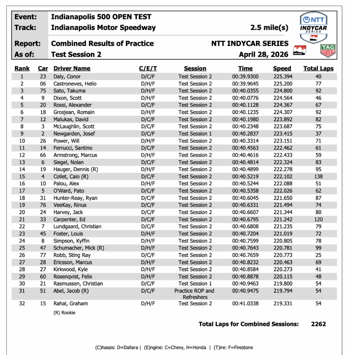| CHEVROLET IN THE NTT INDYCAR SERIES110th Indianapolis 500 presented by Gainbridge2.5-mile Indianapolis Motor Speedway ovalIndianapolis, IndianaOpen Test Day #1 ReportApril 28, 2026 Indianapolis (April 28, 2026) – The first day of the open test for the 110th Indianapolis 500 presented by Gainbridge was led by Dreyer & Reinbold Racing, with Conor Daly fastest overall and Jack Harvey quickest with no tow. Daly’s fastest overall lap of the day in the No. 23 Dreyer & Reinbold Chevrolet was 225.394mph. “Good to get back in the swing of things here. The team did a great job of preparing all winter for this day. It’s only Day 1 for us, but it was obviously a good day. Thankful to be working with Chevrolet again and also everyone at ARCO and Kingspan. It’s only Day 1, onto Day 2.” *Note* – the average finishing position of the drivers who have led the first day of the eight previous Indianapolis 500 open tests since the introduction of the 2.2L Twin-Turbo V6 in 2012 is 3.0. Harvey, in the No. 24 Dreyer & Reinbold Chevrolet, was the quickest driver on the Non-Tow timesheet, going 220.318mph without the help of another NTT INDYCAR SERIES car. Scott McLaughlin in the No. 3 Team Penske Chevrolet was the quickest driver in the speed trap at the ‘Yard Of Bricks’ with a speed of 238.786mph, making seven of the eight quickest cars at’ The Brickyard’ powered by Chevrolet. 10 am-12 pm – Veteran Session After strong thunderstorms overnight, the first day of the open test for the 110th Indianapolis 500 presented by Gainbridge got underway on time at 10 am, with installation laps allowed for all 33 drivers in attendance. After the single lap, the track opened for two hours of veteran running. Josef Newgarden, in the No. 2 Team Penske Chevrolet, was the quickest driver in the two hours of veteran running before lunchtime, going 223.415mph on his 28th of 29 laps, with Chevrolet-powered drivers holding down eight of the top ten spots. Joining Newgarden in the top ten were drivers representing five of the six Team Chevy squads that turned laps in the first two hours. Pato O’Ward in the No. 5 Arrow McLaren Chevrolet (3rd), Scott McLaughlin in the No. 3 Team Penske Chevrolet (4th), Santino Ferrucci in the No. 14 A.J. Foyt Racing Chevrolet (5th), David Malukas in the No. 12 Team Penske Chevrolet (6th), Nolan Siegel in the No. 6 Arrow McLaren Chevrolet (7th), Conor Daly in the No. 23 Dreyer & Reinbold Chevrolet, and Christian Rasmussen in the No. 21 ECR Chevrolet. Alexander Rossi in the No. 20 ECR Chevrolet was the quickest Team Chevy driver without a tow, going 219.173mph without the aid of another car and driver, the second-best of the 22 drivers that appeared on the non-tow results. Daly was the quickest driver without help for most of the two-hour session, ending up as the third-best during the session. A pair of Chevrolet-powered drivers, Pato O’Ward at 229.566mph in Turn 1, and Newgarden at the same speed in Turn 3, were the fastest drivers in the speed traps at the end of the 5/8ths of a mile straightaways. “I love this place, exclaimed O’Ward. “Today, I was coming down the tunnel, knowing it was kind of the first day of May, I think it’s good to call it, is awesome. It’s awesome to be here. I genuinely love it more and more and more the longer that I get to come here, to have this opportunity to race at the Indy 500. That was our first run, basically, and it feels good, nothing feels strange, and I’m just happy to be back here.” noon-2 am – Rookie Orientation Program and Veteran Refreshers The next two hours of the first day of the Indianapolis 500 open test were set aside for the drivers who had to complete their Rookie Orientation Program and Veteran Refreshers. Ryan Hunter-Reay, in the No. 31 Arrow McLaren Chevrolet, was the first Team Chevy driver to complete his Veteran Refresher, finishing his 30 laps after only 37 laps of running. Team Chevy drivers Ed Carpenter, in the No. 33 ECR Chevrolet and Jack Harvey, in the No. 24 Dreyer & Reinbold Racing, quickly completed their refreshers. The pair of rookies representing Team Chevy, Caio Collet, in the No. 4 A.J. Foyt Racing Chevrolet and Jacob Abel in the No. 51 Abel Motorsports Chevrolet, easily completed the three phases of the Rookie Orientation Program. “I think it’s obviously the best thing I’ve ever done in my life,” said Collet with a huge smile on his face. “The first time that I ever came here, I saw the guys flying by. I was ‘oh, can I really do that?” Once I got in the car, the team did a phenomenal job prepping me to be here and also to do the laps. We got it all done. We got up to speed quite quickly, and I’m looking forward to running with other cars this afternoon.” The Brazilian driver ended the day as the busiest, completing 138 laps (345 miles) of the iconic oval. Katherine Legge, in the No. 11 HMD Motorsports with A.J. Foyt Racing Chevrolet, was unable to complete her Veteran Refresher and will get an opportunity to get back on track during the lunch break between noon and 1 pm tomorrow. 2 pm – 6 pm The final four hours of the test saw the field looking for groups of cars to simulate race running. The 32 drivers on the track were busy in the four-hour session, completing 1359 circuits of the iconic 2.5-mile oval. Veteran team owner Carpenter was the busiest Team Chevy driver, completing 76 laps of the 2.5-mile oval. |