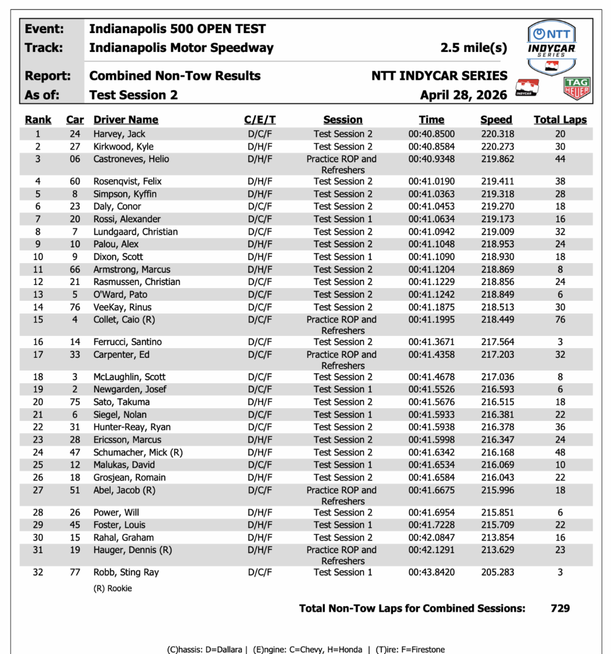 | 110th Indianapolis 500 presented by Gainbridge test day #1 combined no-tow results |