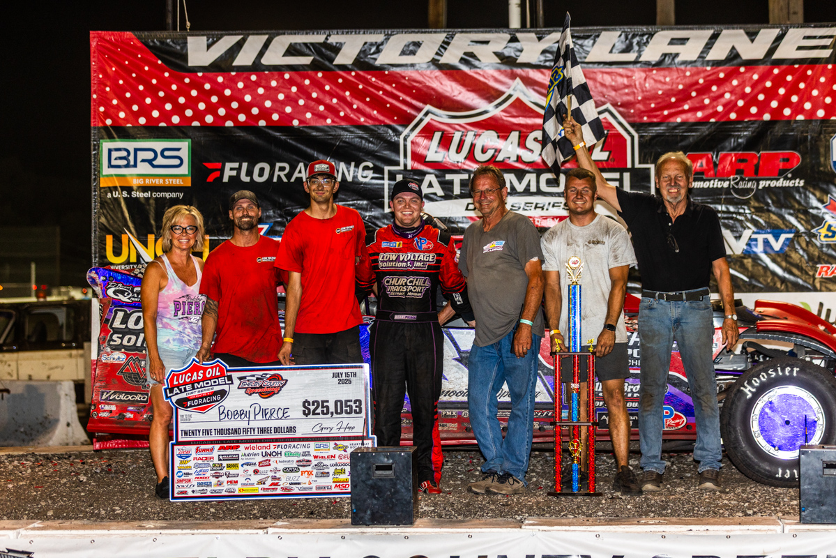 | HARLAN, IA (July 15, 2025) – Bobby Pierce won a thrilling Lucas Oil Late Model Dirt Series presented by FlorRacing event on Tuesday night at Shelby County Speedway, as he led the final 14 laps of the Kosiski Family 53, earning $25,053 for his second Series win of the year. Pierce, who started seventh, passed Ricky Thornton Jr. on lap 39 and then went on to win by 1.249 seconds over fellow Illini driver Brandon Sheppard, who finished second after starting in 12th. Thornton, who started sixth, led three laps and rounded out the Big River Steel Podium in third. Hudson O’Neal, who had to take a provisional starting from the 23rd spot, finished fourth, with Jonathan Davenport, who led the first 36 laps, coming home in fifth. Pierce went to Lucas Oil Victory Lane for the 26th time in his career, surviving a three-wide race for the lead to claim the victory as the Oakwood, Illinois, racer was making his first career start at the Western Iowa facility. “First off, I’ve got to say thank you to Shelby County Speedway — it’s an awesome race track. Thank you to all the fans for coming out tonight and packing this place. I kind of had to make some of the holes myself with the sliders; those were just death sliders there. I knew I had to make them check-up. We just had to get something going; we needed a consistent line of cars running the top. I was waiting on Brandon (Overton) to make another move like he did before— that one caution he started sliding Thornton, so that let me get in the mix, but someone had to start it, so I just started throwing the bombs.” “What an awesome race, JD and I were pushing hard, and I let Thornton get in there. I thought, man, I don’t want to get him in the mix; you know, it was another car to race. It’s very tough to keep your composure sometimes. You had Dennis Erb on the bottom, and if you messed around up there too much, he was getting a good line down there. Watching the videos from last year taught me a lot about where to run.” Sheppard, who won Saturday night’s race at Lucas Oil Speedway, continued his mid-season surge in Rocket1 and earned $10,000 for finishing second. “I knew he (Pierce) was going to be good, so I kind of followed him throughout and watched the lines he was running, using that to judge my own performance. He was really impressive, so congratulations to Bobby and Ricky. Thanks to all the fans for coming out; we appreciate all of you. Man, track prep tonight was on point—that thing was racy. Last year, it was pretty bottom-dominant, but they learned from that and fine-tuned it perfectly for the feature.” Thornton, who now resides back in Iowa, was aiming for his 11th series win of 2025 and is now just 25 points behind Davenport heading to Huset’s Speedway on Thursday night. “Man, I felt like I had a lot of fun last night, but tonight was actually more fun. Anytime you can race JD and Bobby like that and throw sliders like that, knowing they aren’t going to run you over, it’s pretty awesome. Of course, it sucks not to win a race like that, but Bobby was really good, and Shepp was really good as well. I feel like I need a little more to get a bit better, but we’re improving on these small bullrings, so hopefully we’ll go to Huset’s and be really good. Hats off to everyone here — the whole city came together and helped us with gift cards and stuff like that. Hopefully we come back for a 2 or 3-day show.” The winner’s Bobby Pierce Racing, Longhorn Chassis is powered by a Vic Hill Racing Engine and sponsored by Low Voltage Solutions, Rio Grande Waste Services, Churchill Transport, Collins Brothers Towing, Mesilla Valley Transportation, Toyota of Danville, Carnaghi Towing and Repair, Ted Brown’s Quality Paint and Body Shop, Fast 1 Speed Shop. Leka Tree Service, Fast Shafts, Floyd’s Waste Systems, Duromax Racing Oil, VP Fuels, and Bert by Budda. Completing the top ten were Brandon Overton, Garrett Alberson, Dennis Erb Jr., Devin Moran, and Carson Ferguson. Lucas Oil Late Model Dirt Series Race Summary Kosiski Family 53Tuesday, July 15, 2025Shelby County Speedway – Harlan, IA Allstar Performance Time TrialsFast Time Group A: Hudson O’Neal | 13.400 seconds (Overall)Fast Time Group B: Jonathan Davenport | 13.494 seconds Penske Shocks Heat Race #1 Finish (8 Laps, Top 4 Transfer): 1. 58-Garrett Alberson[2]; 2. 99-Devin Moran[3]; 3. 22-Daniel Hilsabeck[5]; 4. 79-Donald McIntosh[4]; 5. 74X-Ethan Dotson[6]; 6. 93L-Cory Lawler[7]; 7. 53-Andrew Kosiski[10]; 8. 24L-Bill Leighton[8]; 9. 62-Justin Zeitner[9]; 10. 71-Hudson O’Neal[1] Summit Racing Products Heat Race #2 Finish (8 Laps, Top 4 Transfer): 1. 76N-Blair Nothdurft[1]; 2. 32-Bobby Pierce[4]; 3. 93-Carson Ferguson[5]; 4. 38T-Dylan Thornton[2]; 5. 18-Jesse Sobbing[7]; 6. 04-Tad Pospisil[6]; 7. 19R-Ryan Gustin[3]; 8. 35D-Dylan Sillman[9]; 9. 6J-Jake Neal[8] Cool-It Thermo-Tec Heat Race #3 Finish (8 Laps, Top 4 Transfer): 1. 49-Jonathan Davenport[1]; 2. 20RT-Ricky Thornton Jr[2]; 3. 76-Brandon Overton[3]; 4. 18D-Daulton Wilson[4]; 5. 43-Derrick Stewart[5]; 6. 19M-Spencer Hughes[6]; 7. 60-Dan Ebert[7]; 8. 17SS-Brenden Smith[10]; 9. 80-Allan Hopp[8]; 10. 17SR-Brody Smith[9] Simpson Race Products Heat Race #4 Finish (8 Laps, Top 4 Transfer): 1. 28-Dennis Erb Jr[1]; 2. 6-Clay Harris[7]; 3. 1-Brandon Sheppard[4]; 4. 16-Tyler Bruening[2]; 5. 22*-Drake Troutman[5]; 6. 15M-Shane DeMey[6]; 7. 10-Junior Coover[9]; 8. 07-Ben Sukup[8]; 9. 50-Kayden Clatt[3] Fast Shafts B-Main Race #1 Finish (8 Laps, Top 3 Transfer): 1. 74X-Ethan Dotson[1]; 2. 18-Jesse Sobbing[2]; 3. 19R-Ryan Gustin[6]; 4. 62-Justin Zeitner[9]; 5. 24L-Bill Leighton[7]; 6. 04-Tad Pospisil[4]; 7. 93L-Cory Lawler[3]; 8. 6J-Jake Neal[10]; 9. 53-Andrew Kosiski[5]; 10. 35D-Dylan Sillman[8]; 11. 71-Hudson O’Neal[11] UNOH B-Main Race #2 Finish (8 Laps, Top 3 Transfer): 1. 43-Derrick Stewart[1]; 2. 60-Dan Ebert[5]; 3. 15M-Shane DeMey[4]; 4. 17SS-Brenden Smith[7]; 5. 50-Kayden Clatt[10]; 6. 19M-Spencer